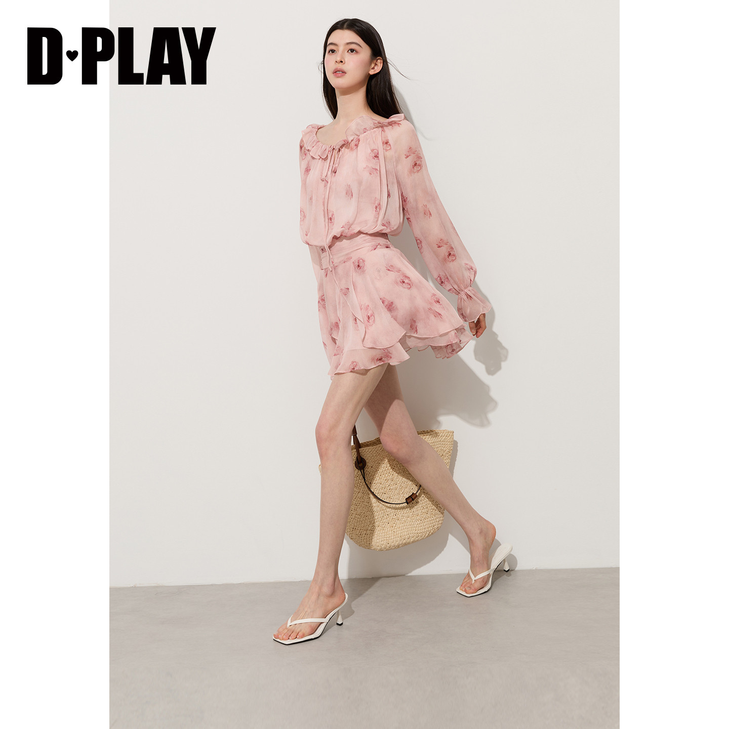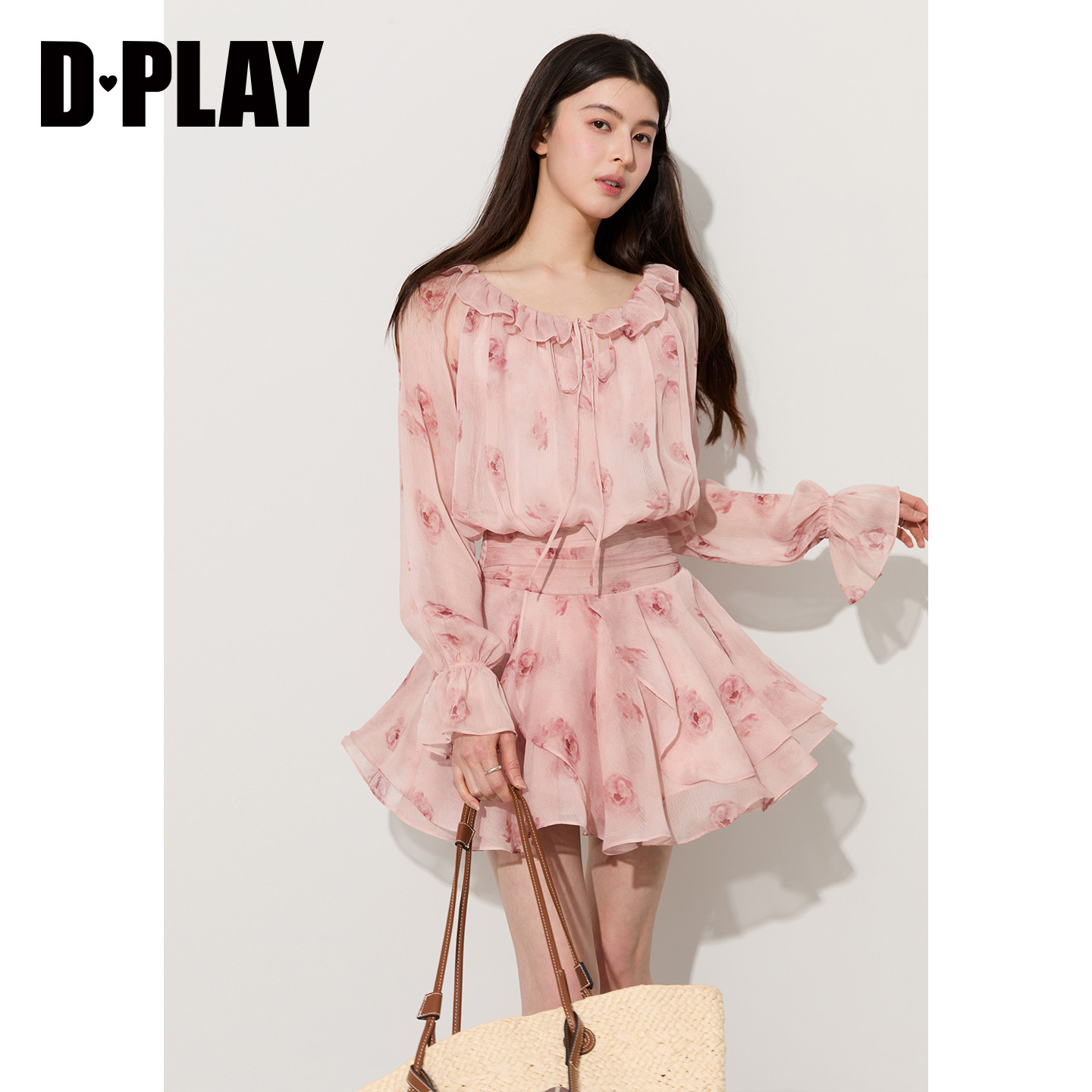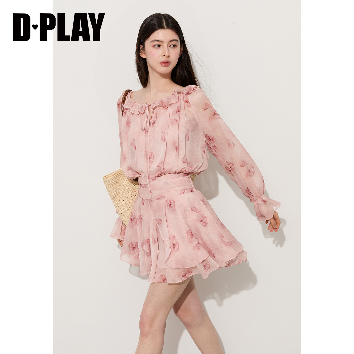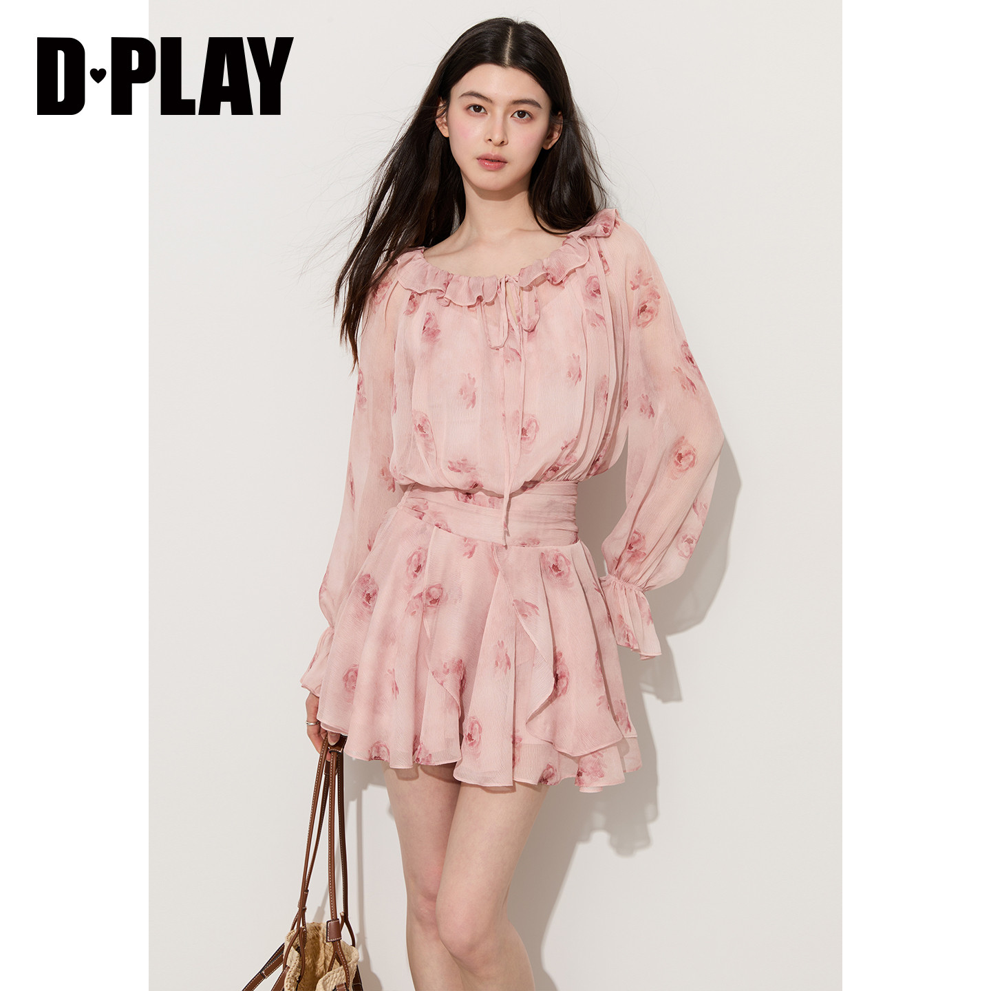 DPLAY粉色长袖连衣裙印花圆领系带法式短裙裙子女2026年春季新款