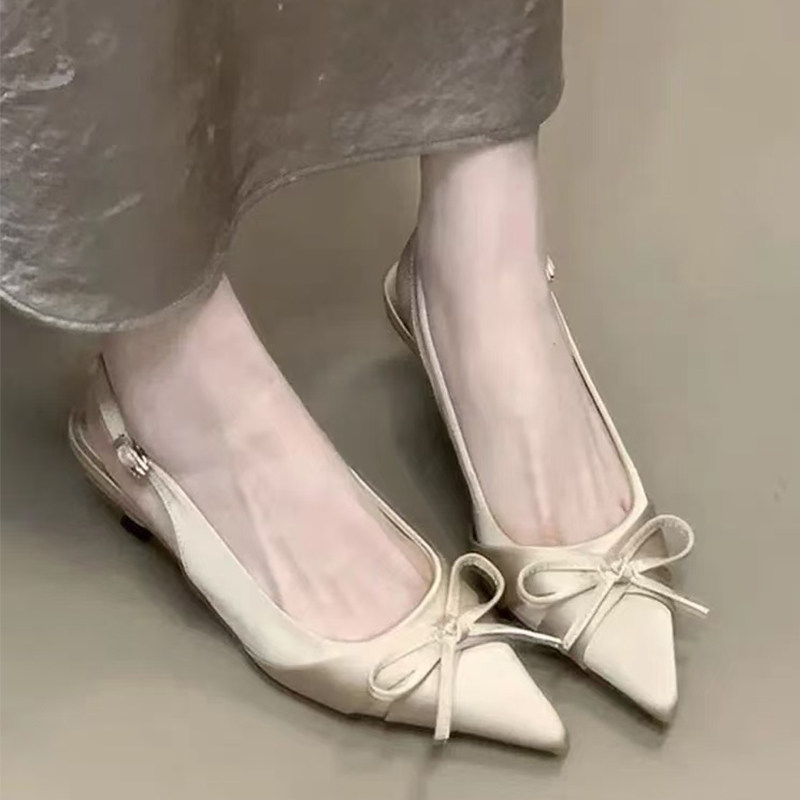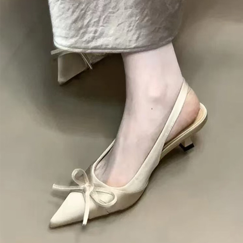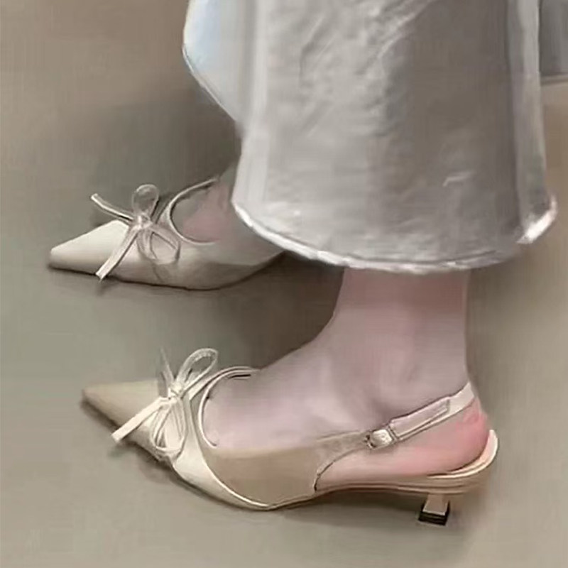 法式尖头高跟鞋女春夏季配裙子缎面单鞋后空半包头凉鞋细跟伴娘鞋