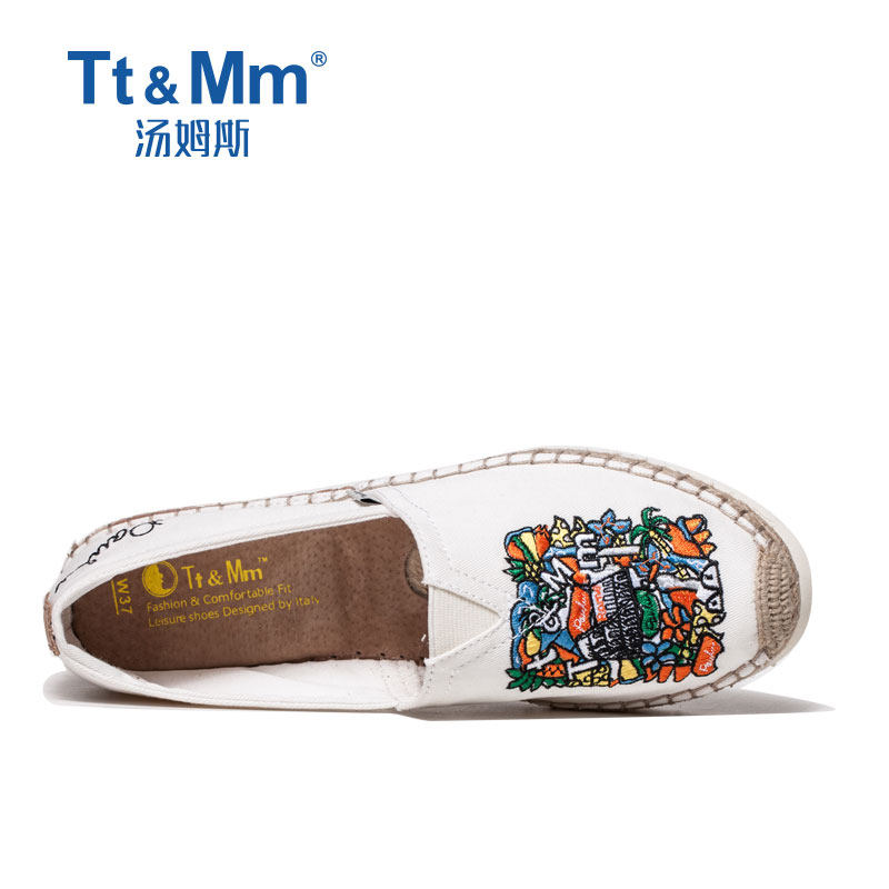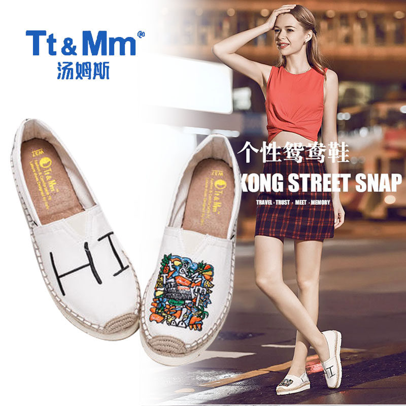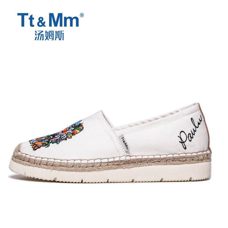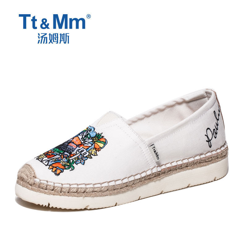 Tt&Mm/汤姆斯女鞋夏季薄款透气刺绣白色玛丽布鞋懒人一脚蹬渔夫鞋