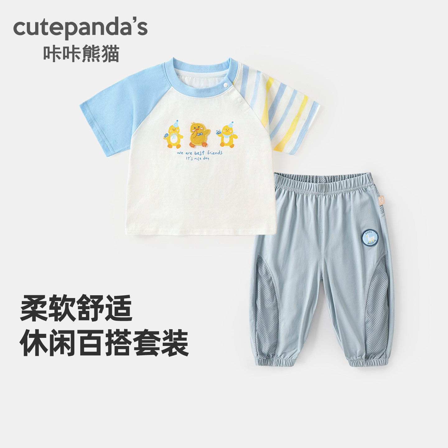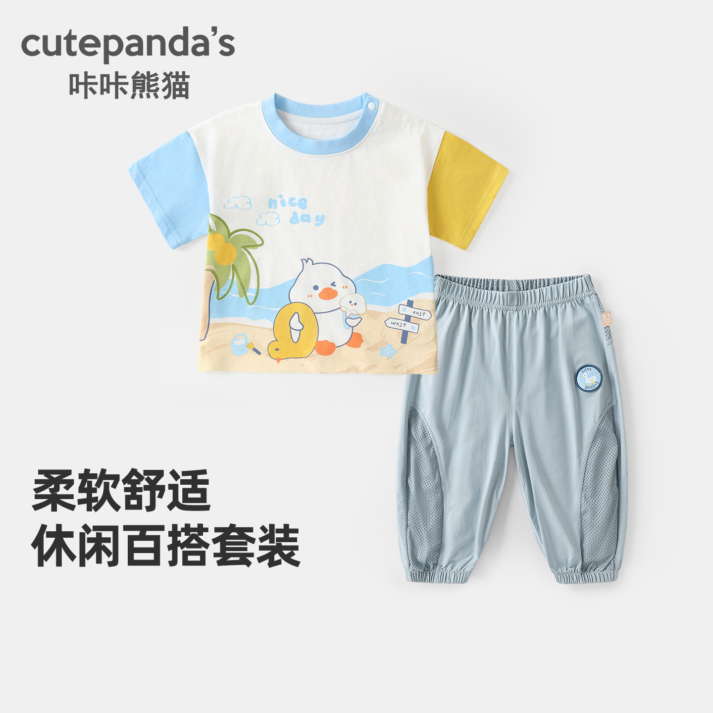 咔咔熊猫宝宝卡通短袖T恤防蚊裤套装夏款男童女童两件套夏季童装
