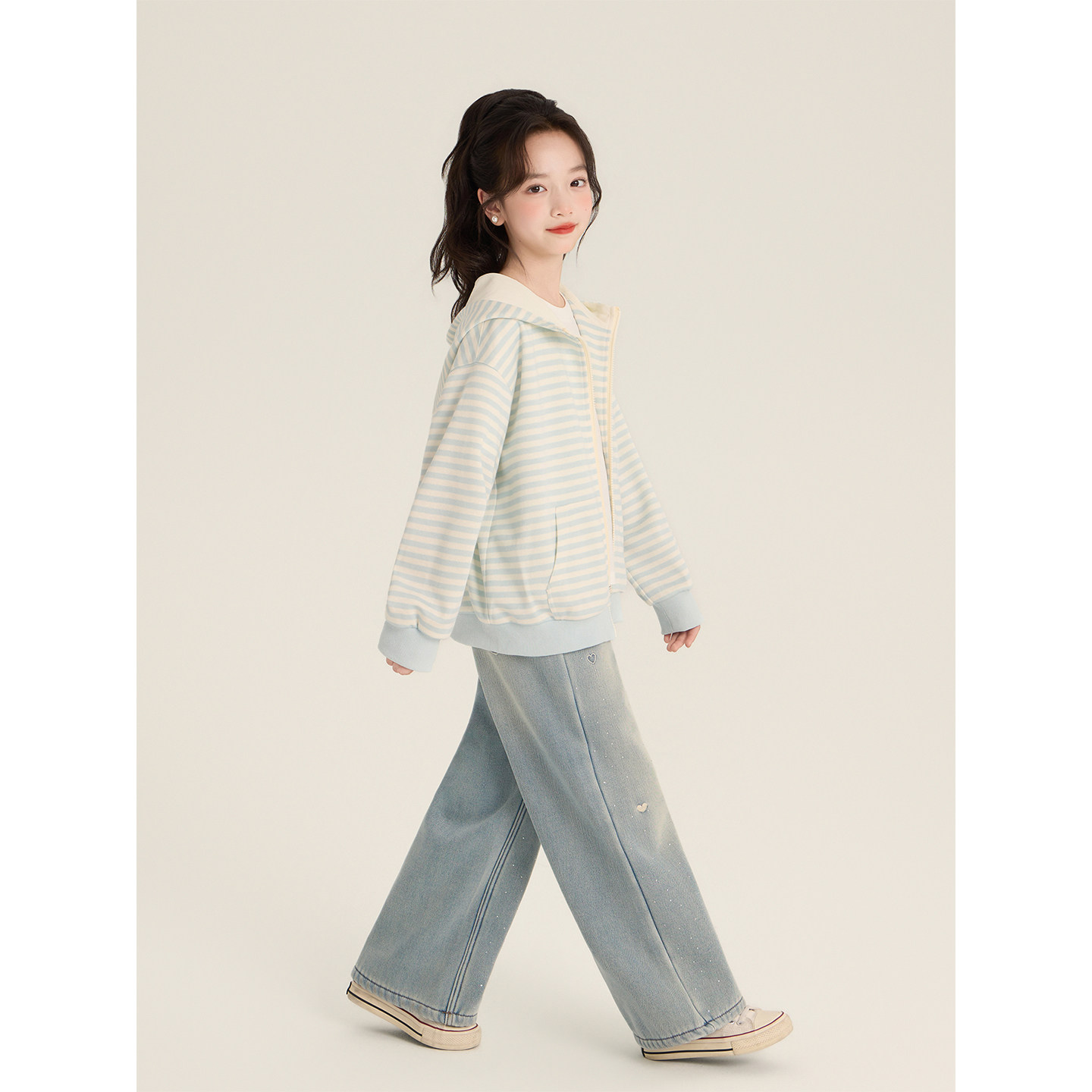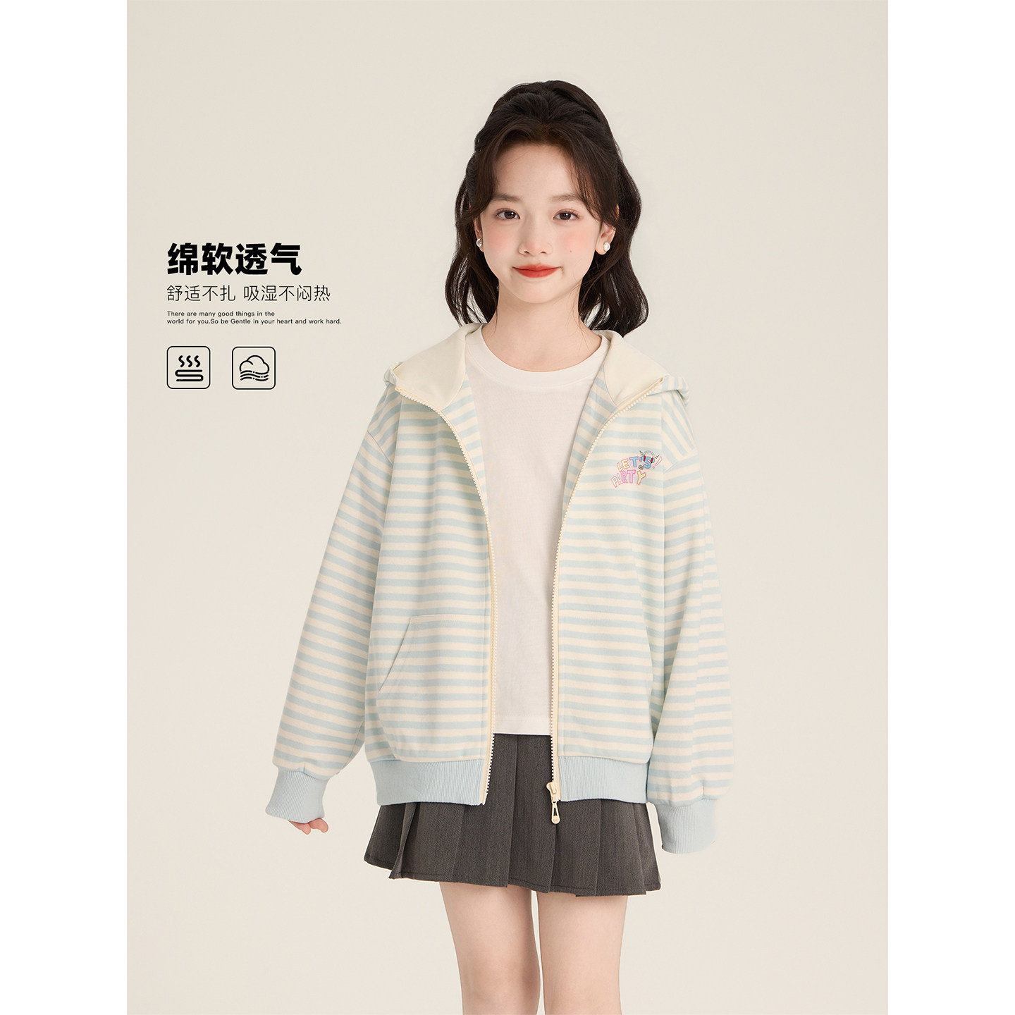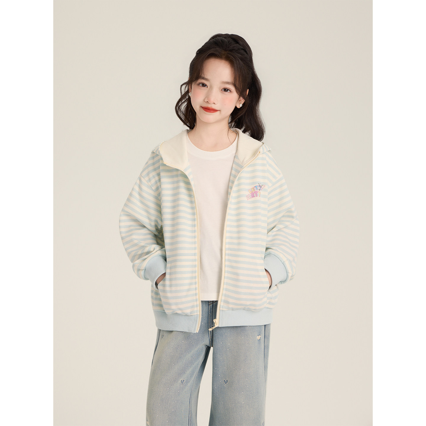 Amybaby女童上衣春季2026新款美式条纹连帽宽松休闲印花拉链卫衣