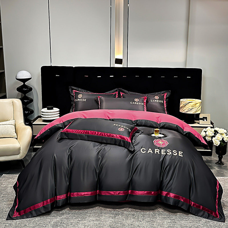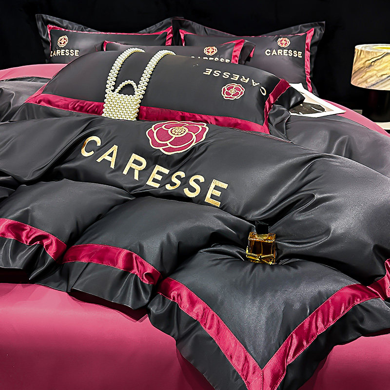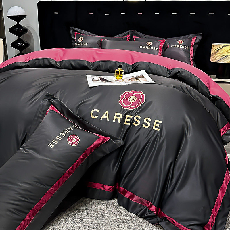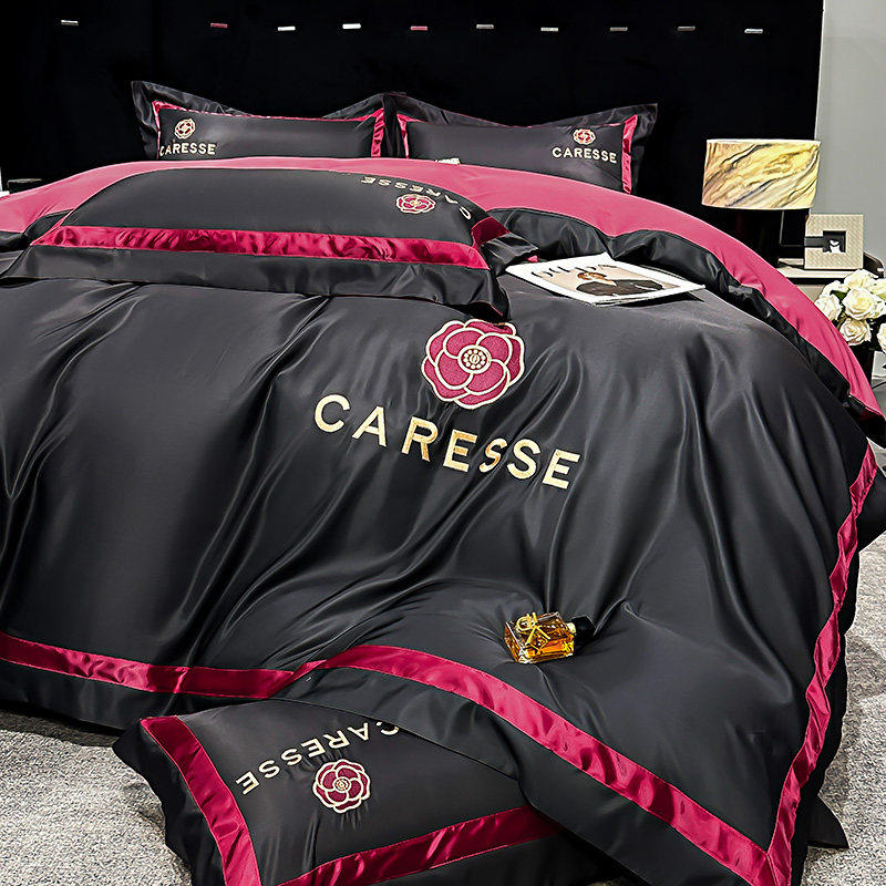 2026新款水洗真丝床上四件套黑色系男生冰丝被套床笠款轻奢高级感