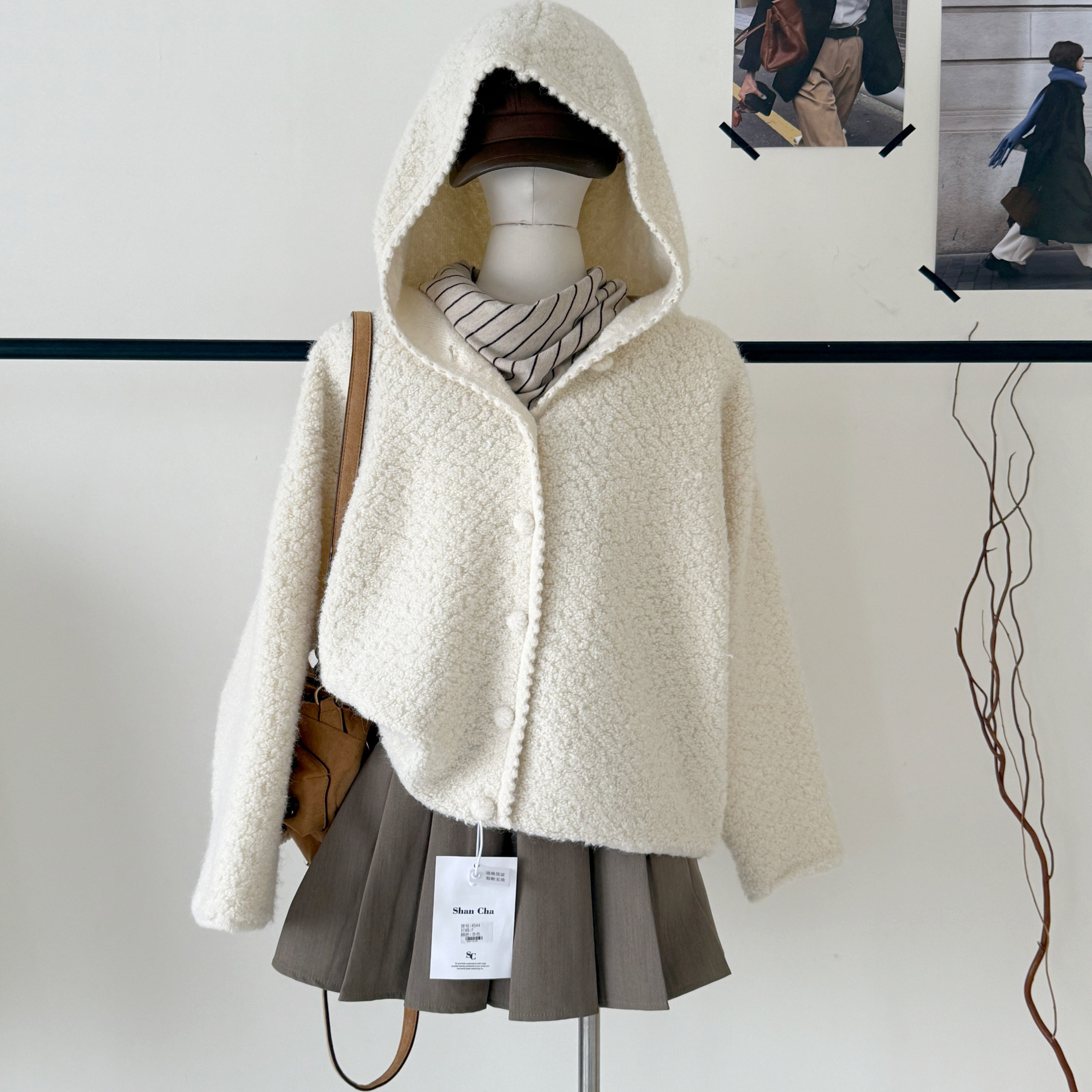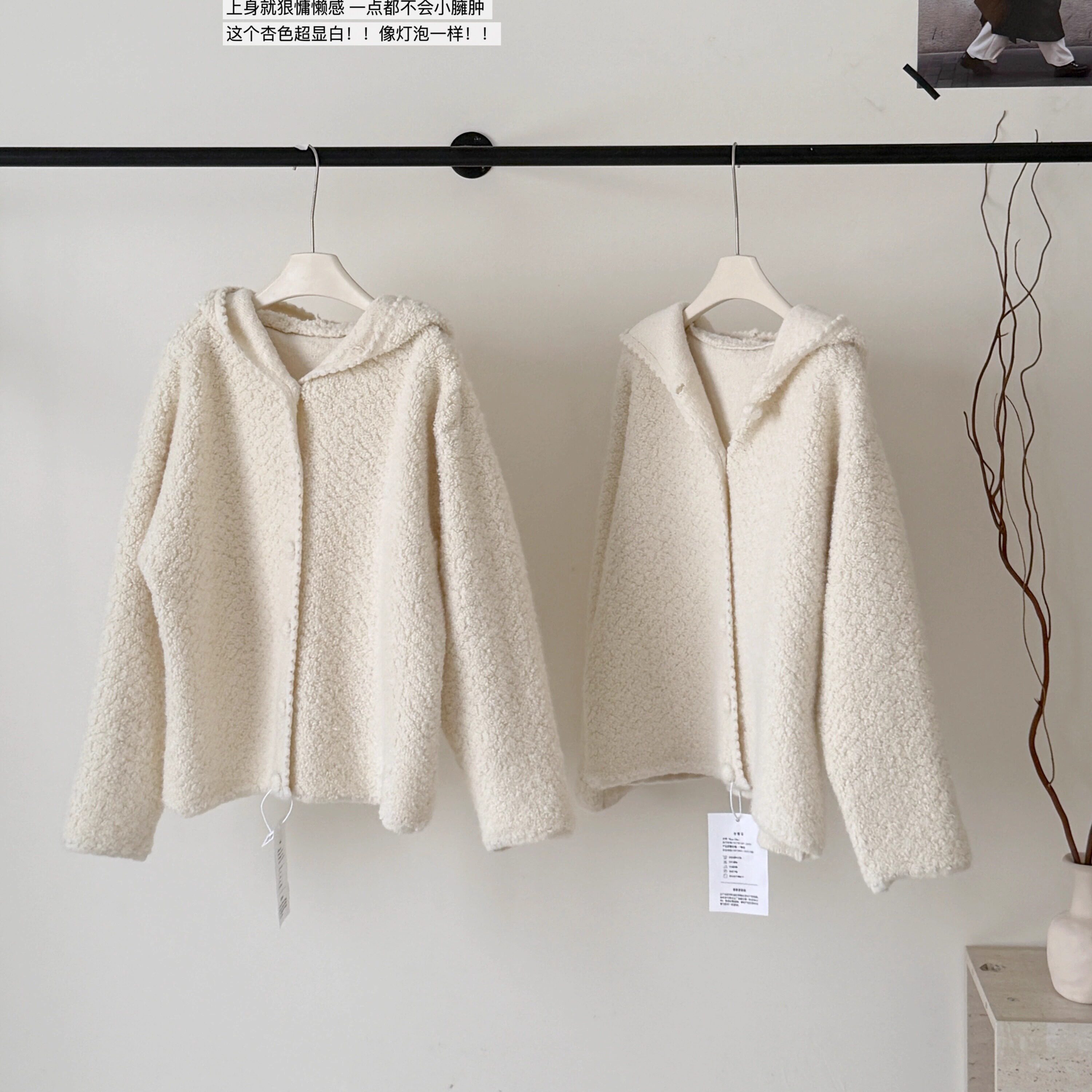 慵懒连帽毛衣开衫女2025秋冬新款奶白色长袖宽松软糯加厚针织外套