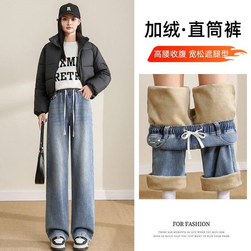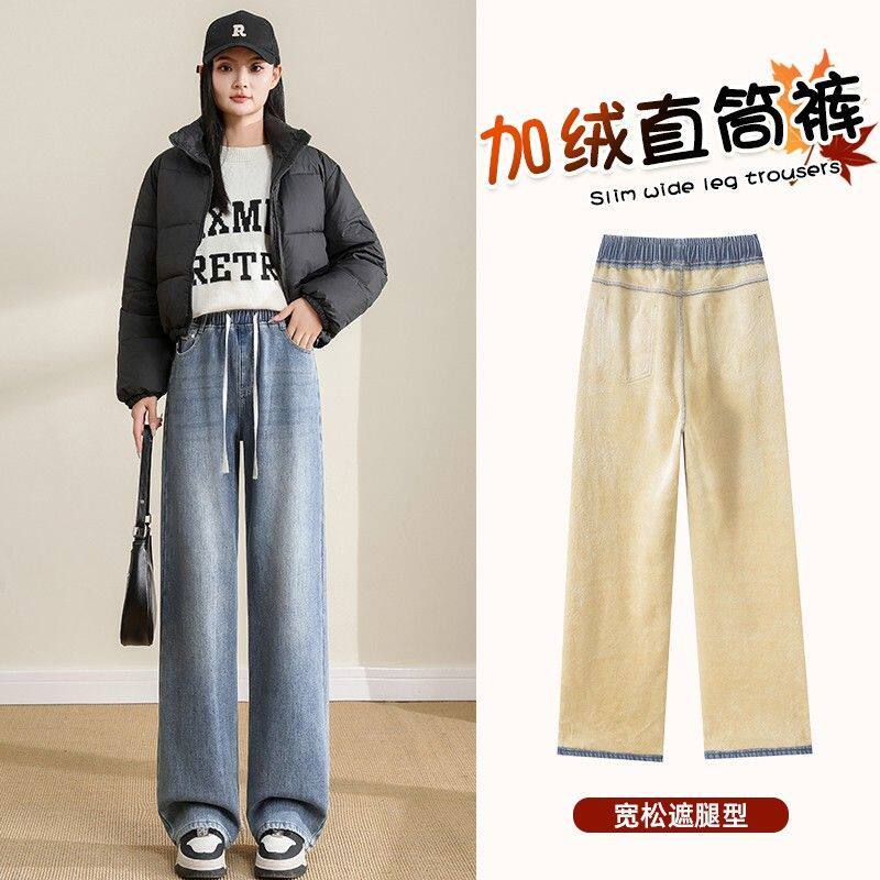 学生加绒牛仔裤女款2026春秋新款直筒宽松高中初中生少女阔腿裤子