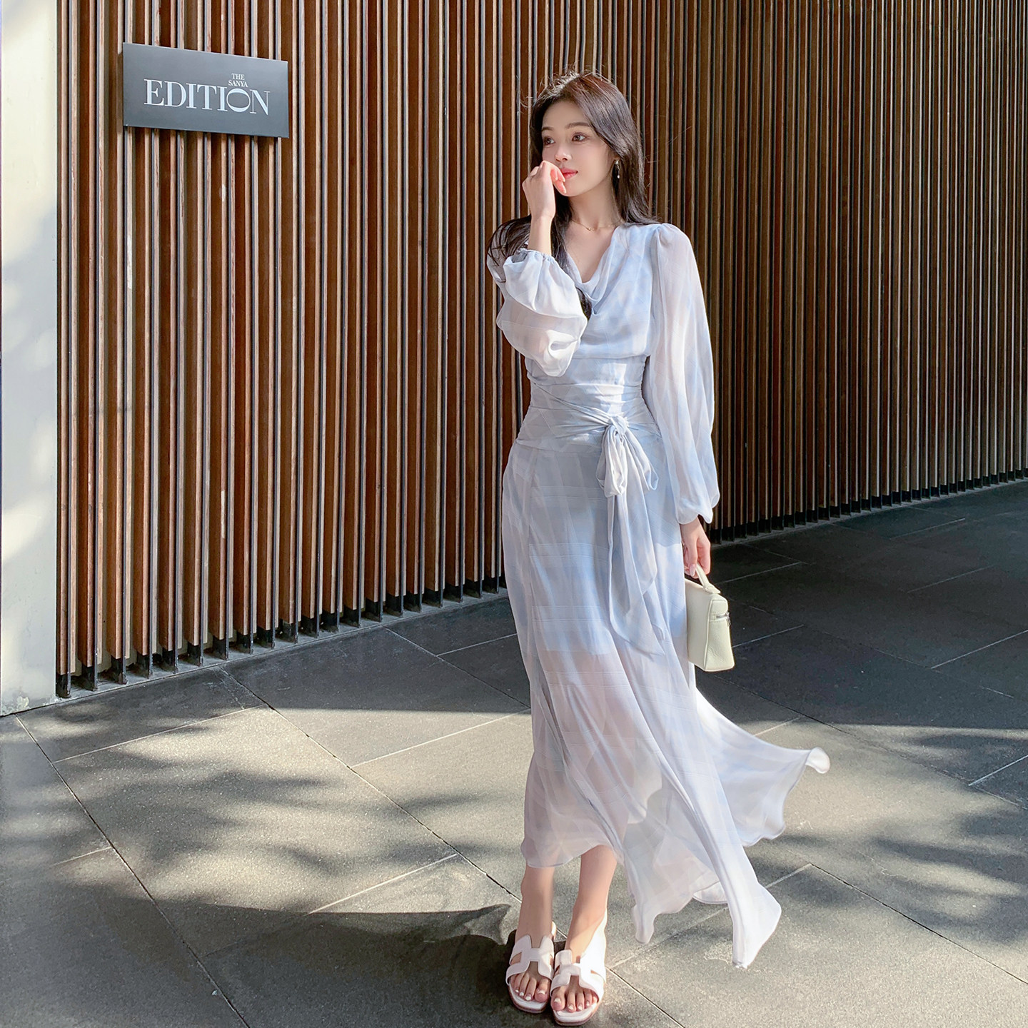 ByYou 夏季新款气质荡领灯笼袖蓝色格子雪纺连衣裙短款收腰碎花裙