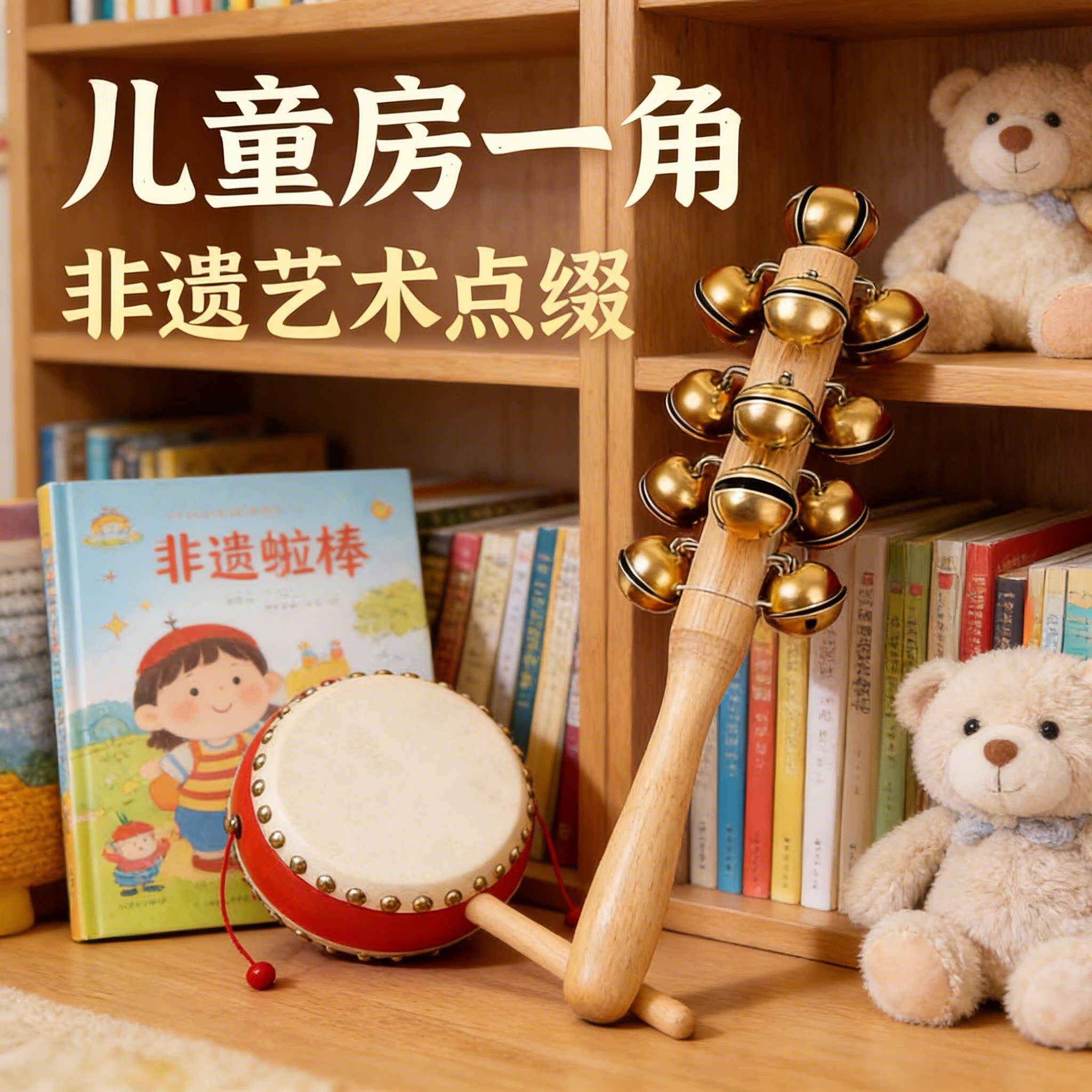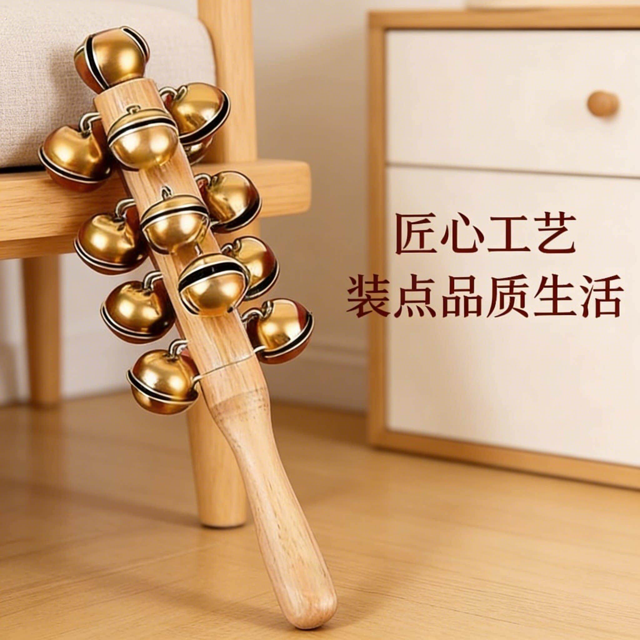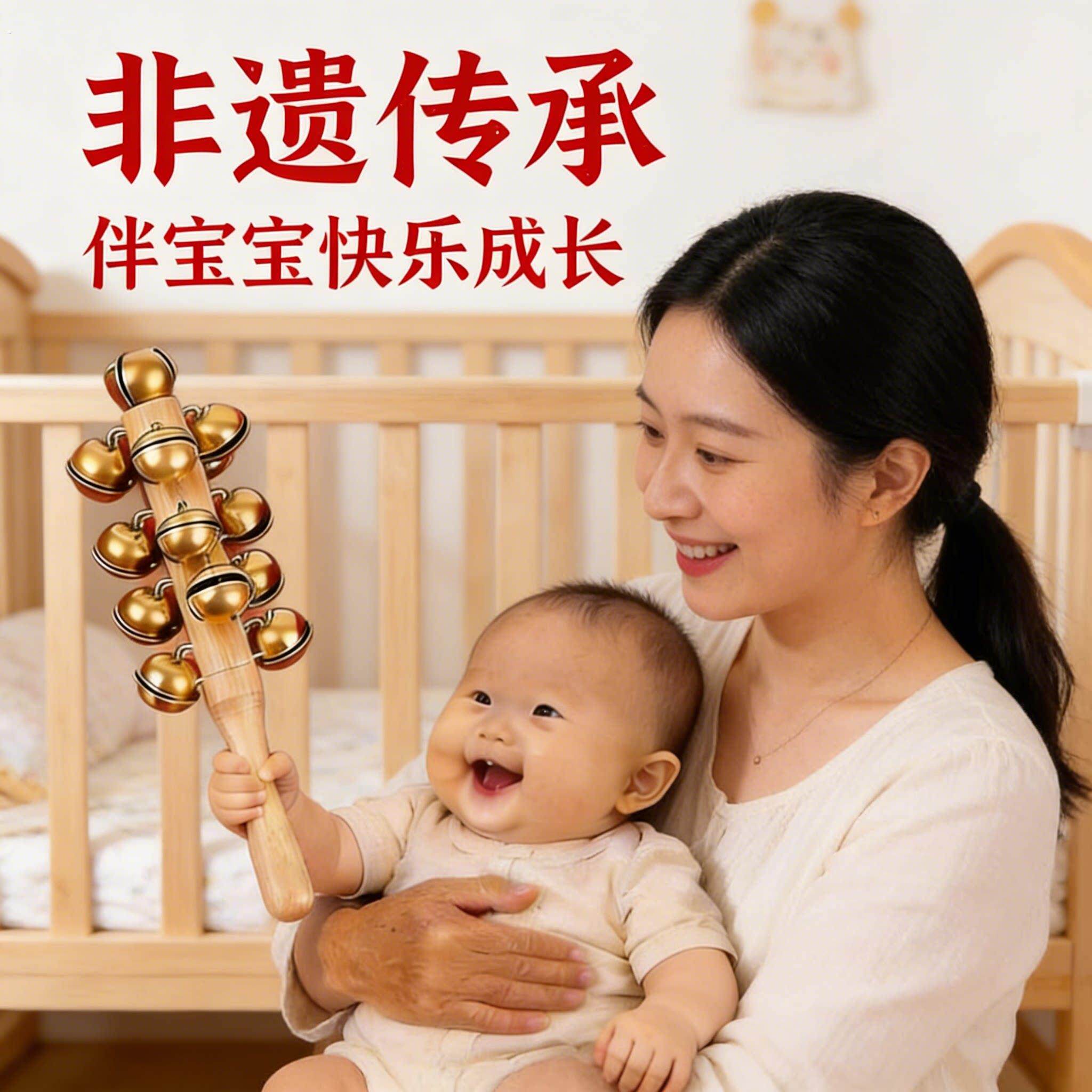 黄铜铃铛哗啦棒老式羊皮桃木拨浪鼓手工非遗牛皮新生婴儿可啃咬