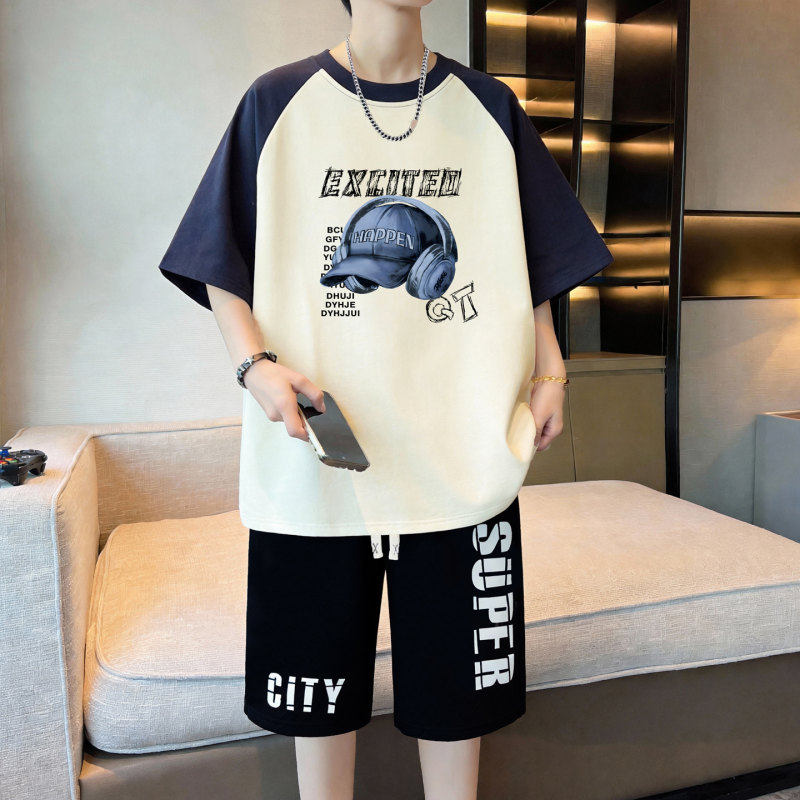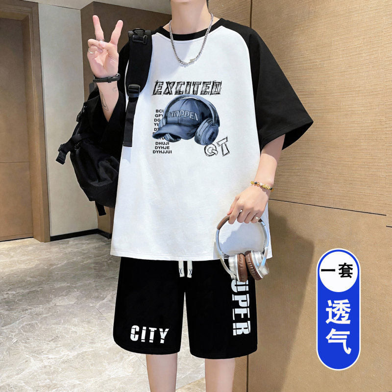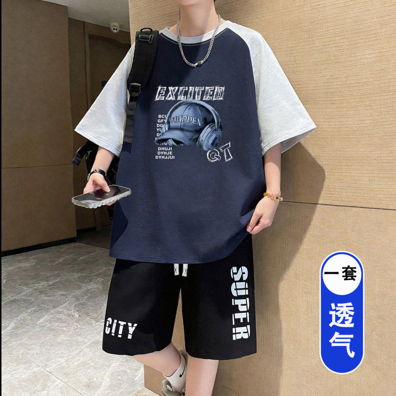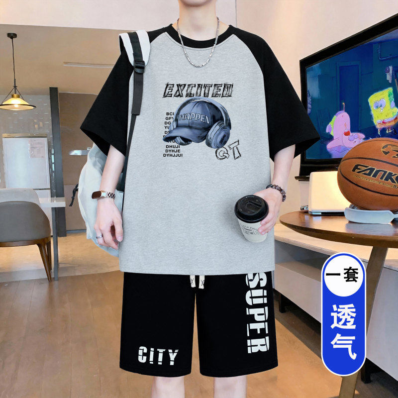 青少年夏季套装男孩2026新款初中生学生冰丝短袖t恤大童男装一套