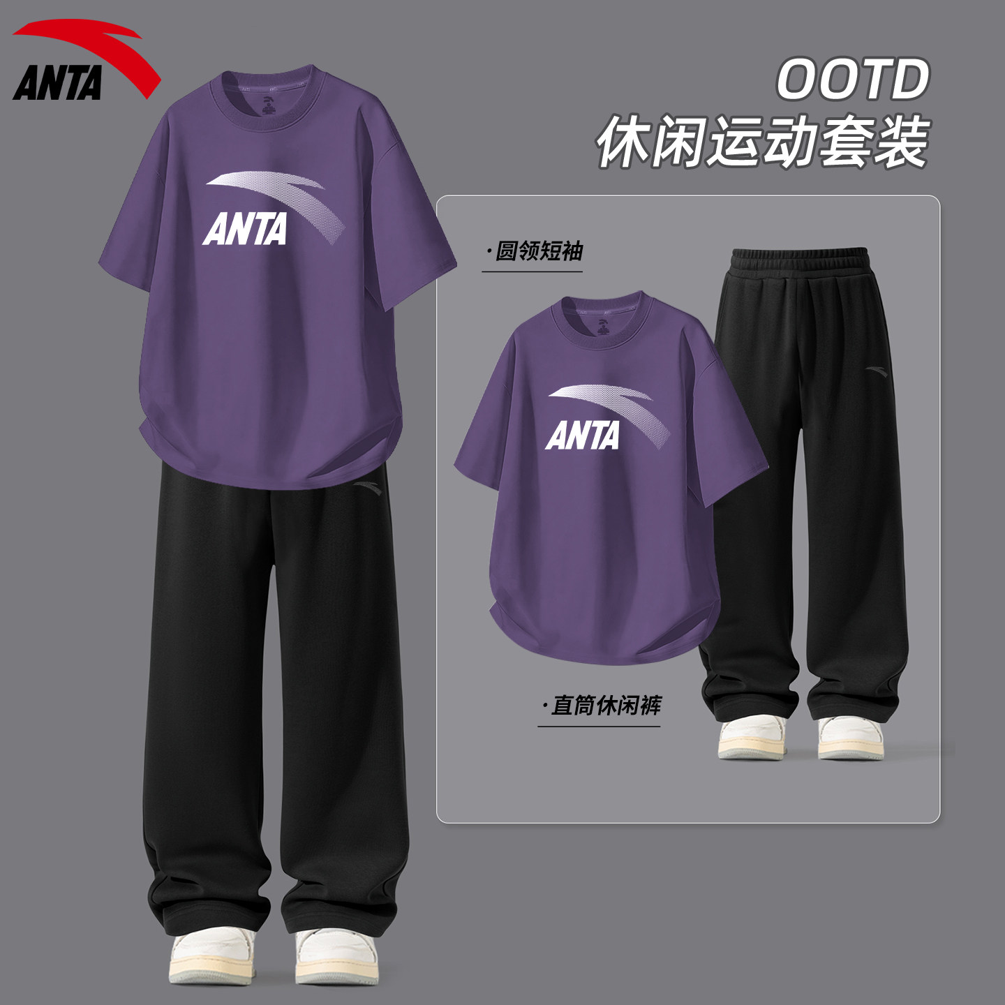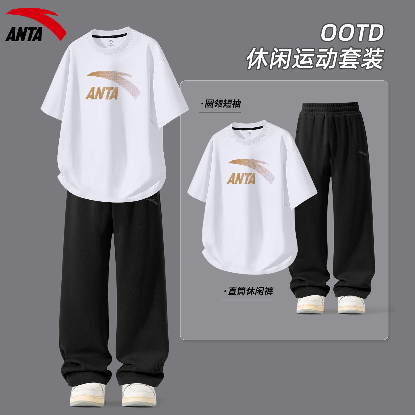 安踏青少年运动套装男印花短袖直筒长裤夏季新款休闲透气两件套