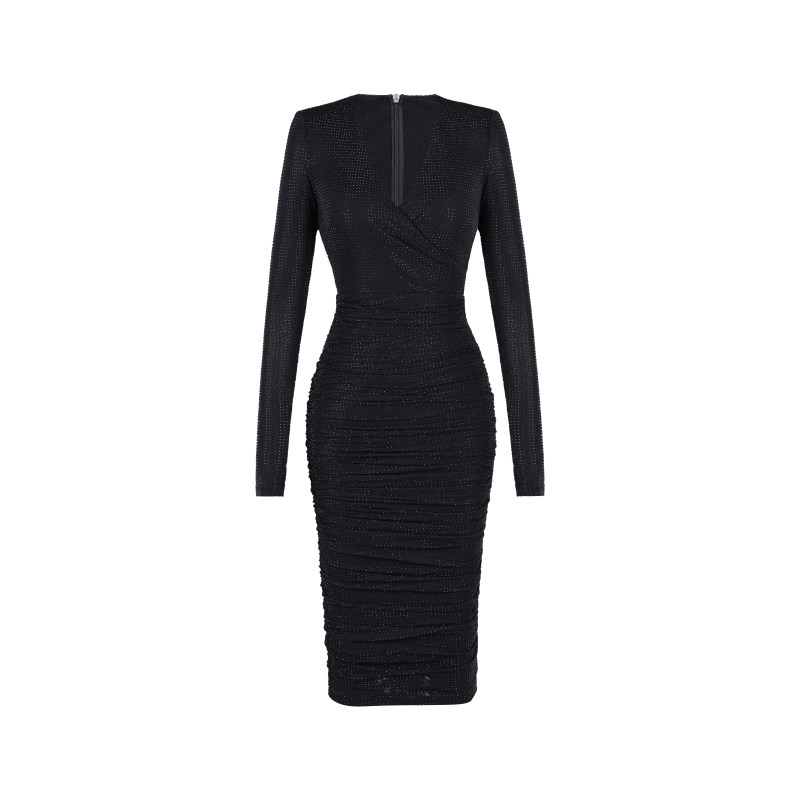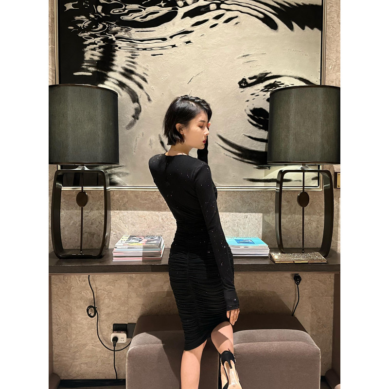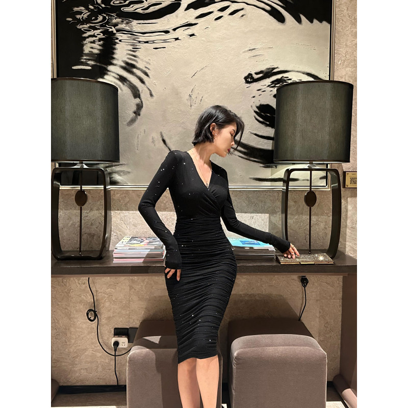 XULU原创秋季黑色水晶麻纱烫钻性感包臀裙收腰褶皱长袖V领连衣裙