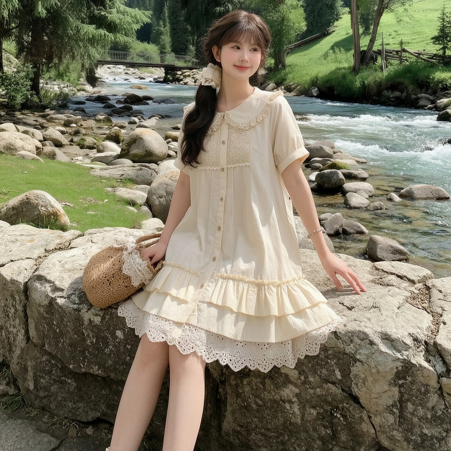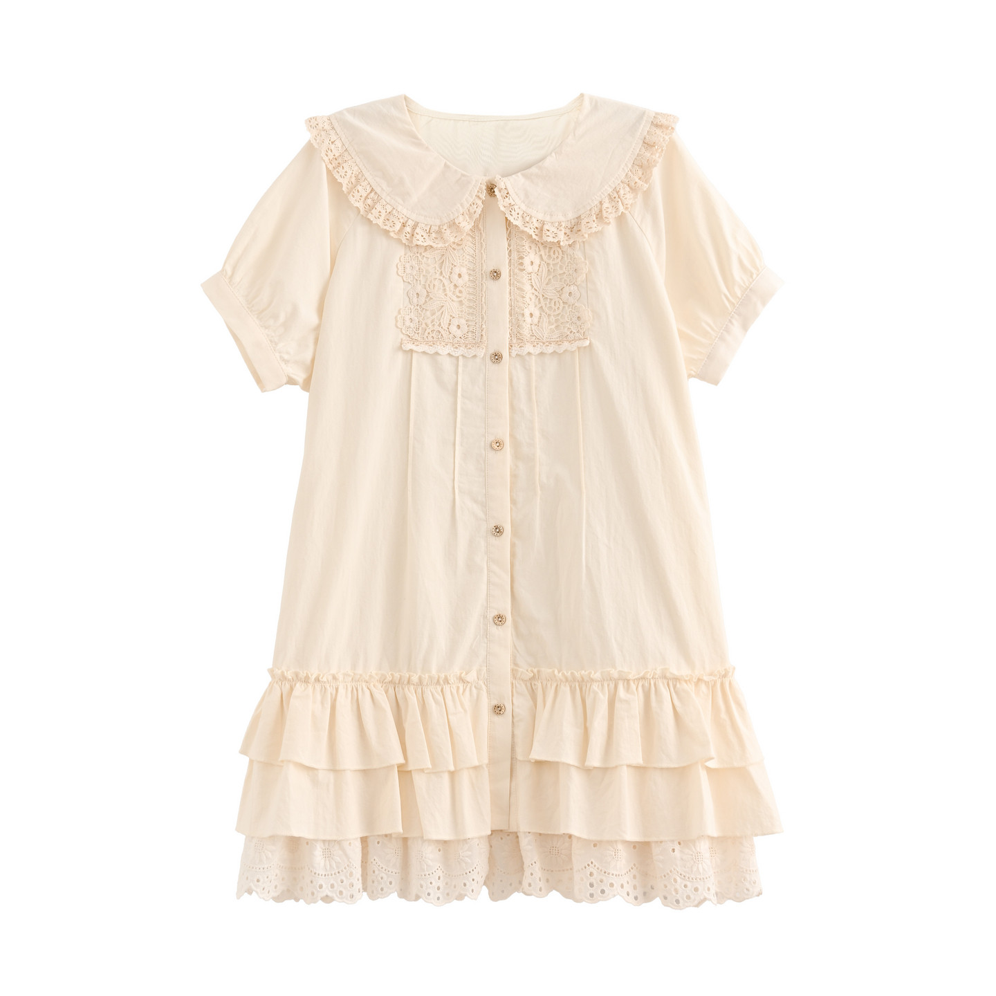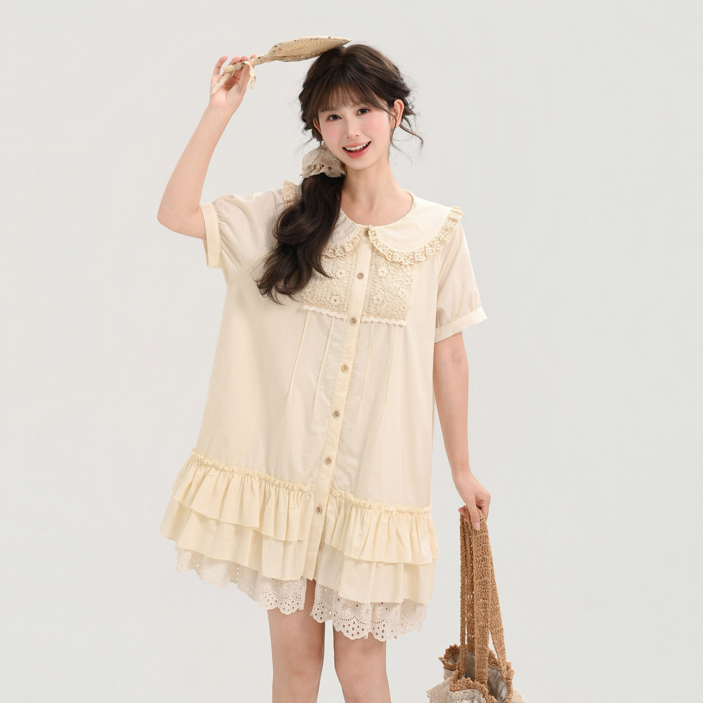 森女部落甜美风蕾丝娃娃领纯棉长袖连衣裙女2026新款宽松百搭春款