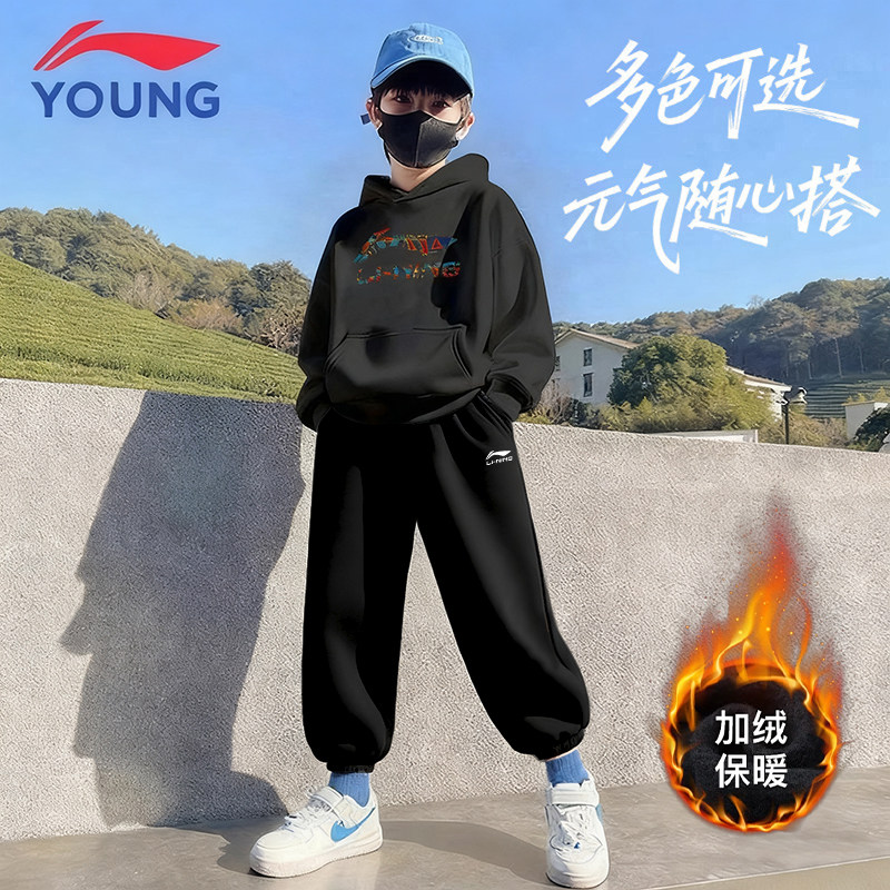 李宁童装儿童套装男童休闲秋季加绒卫衣卫裤青少年保暖秋冬两件套