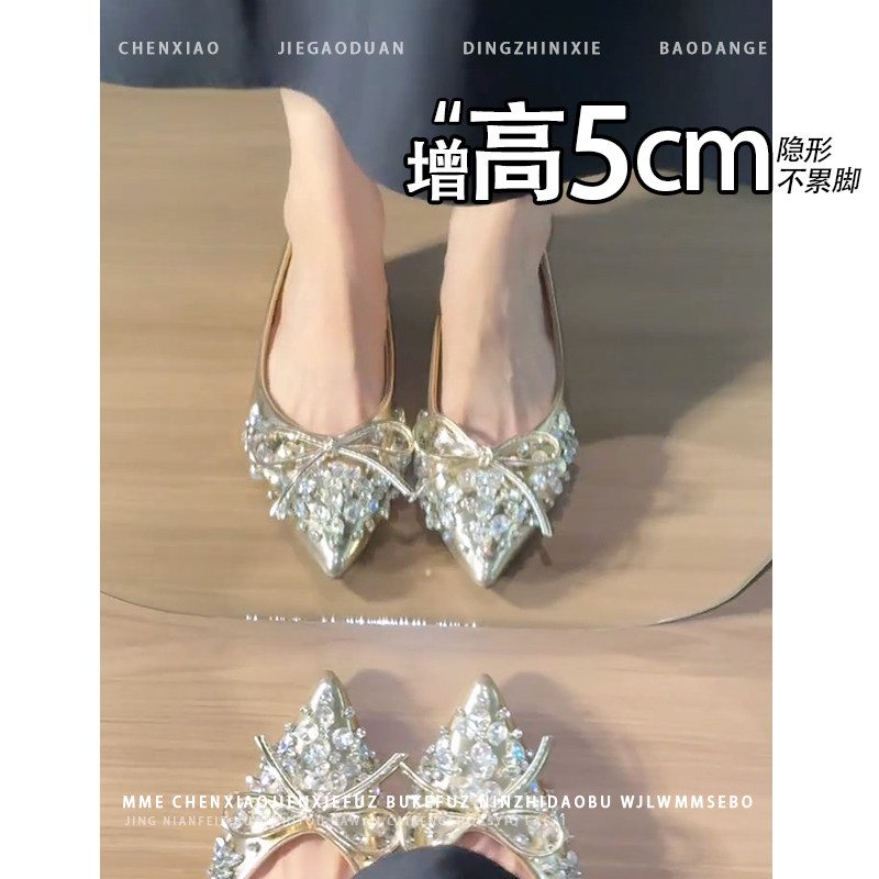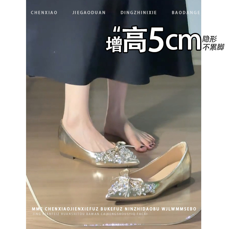 不累脚!小个子内增高5CM玛丽珍鞋2026秋尖头水钻蝴蝶结浅口单鞋
