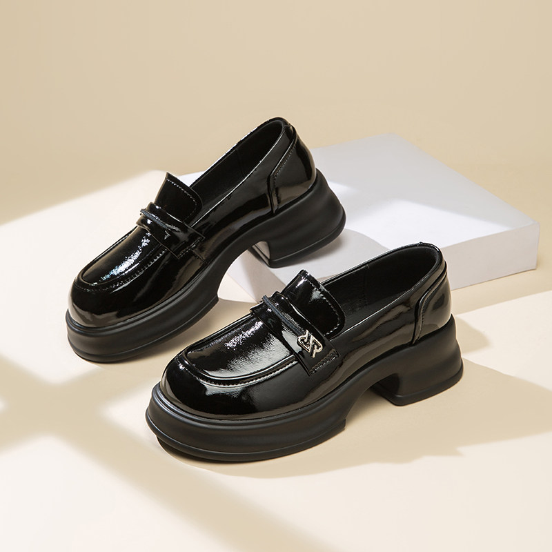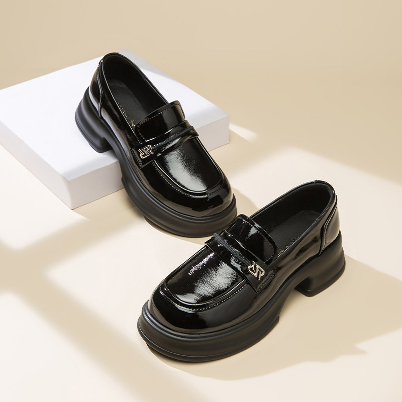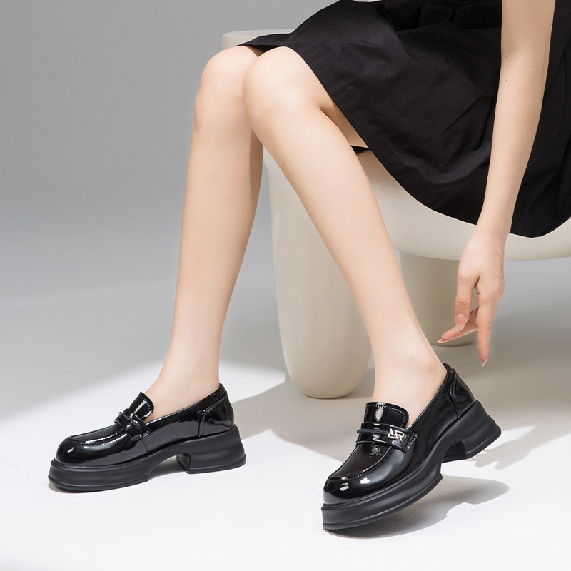 红蜻蜓厚底增高乐福鞋2025春秋新款黑色小皮鞋真皮高跟配裙子女鞋