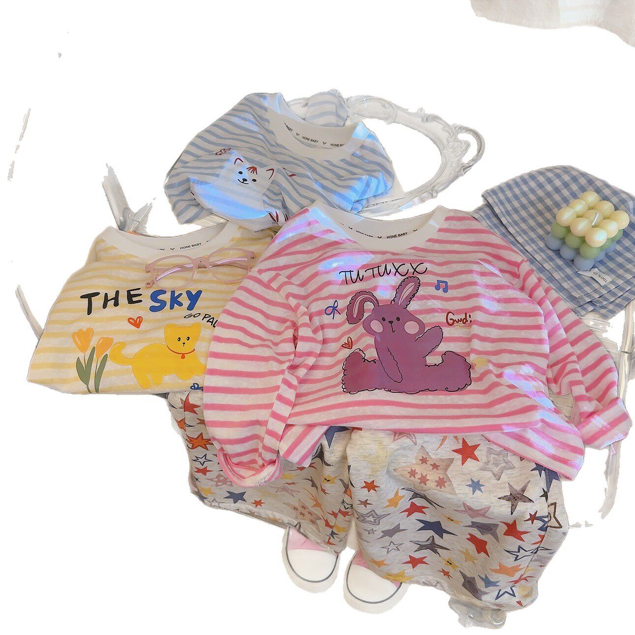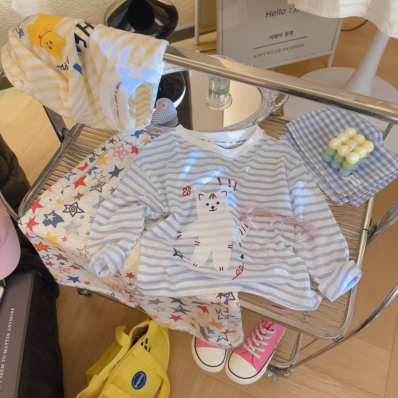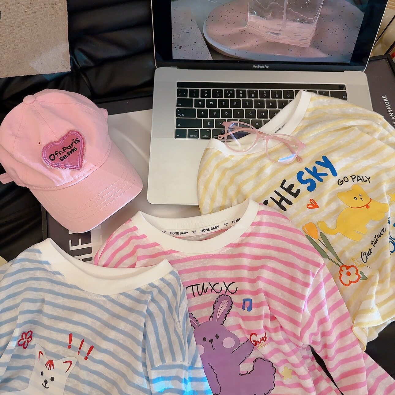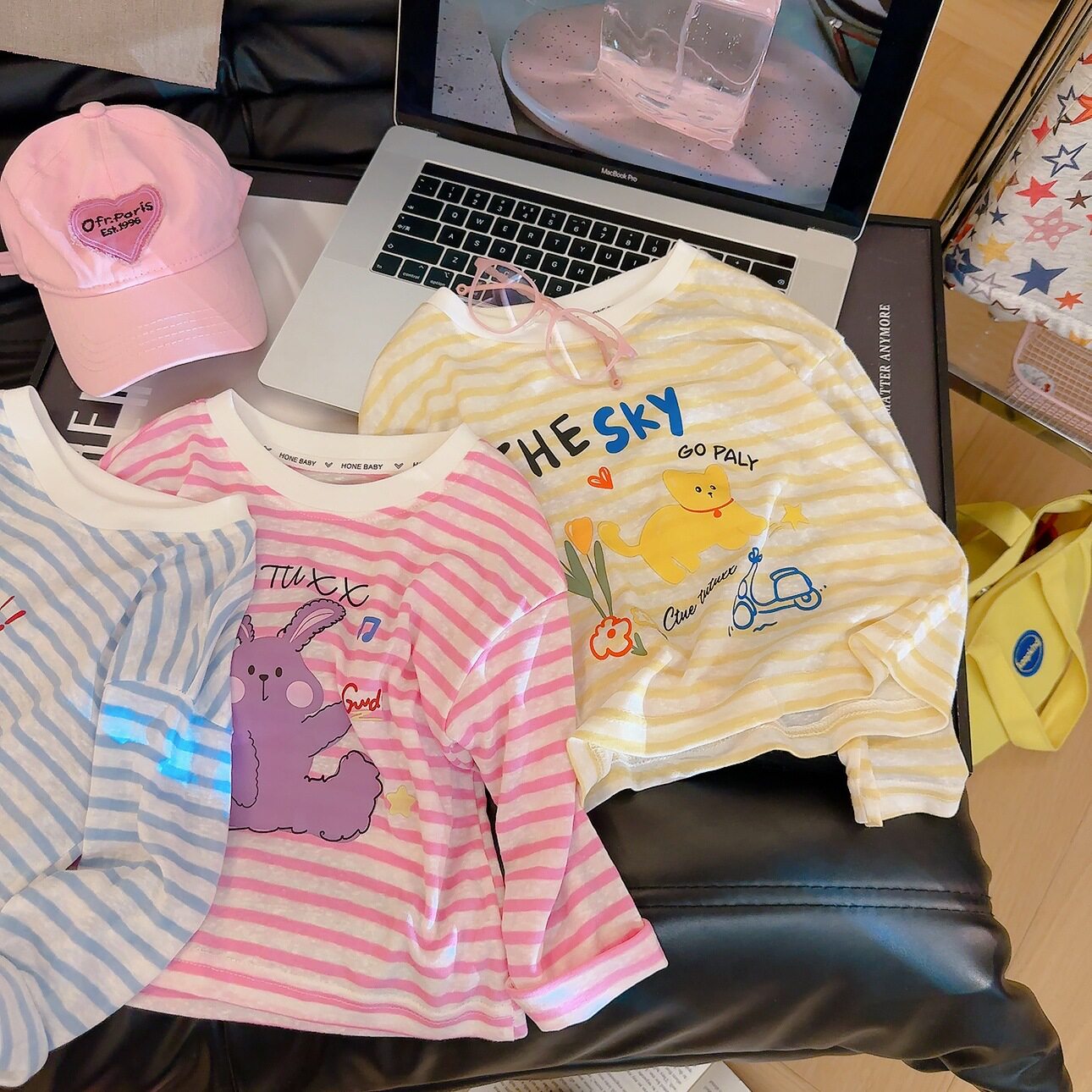 2026春夏多巴胺条纹网纱T恤女童圆领长袖薄款透气防晒上衣罩衫
