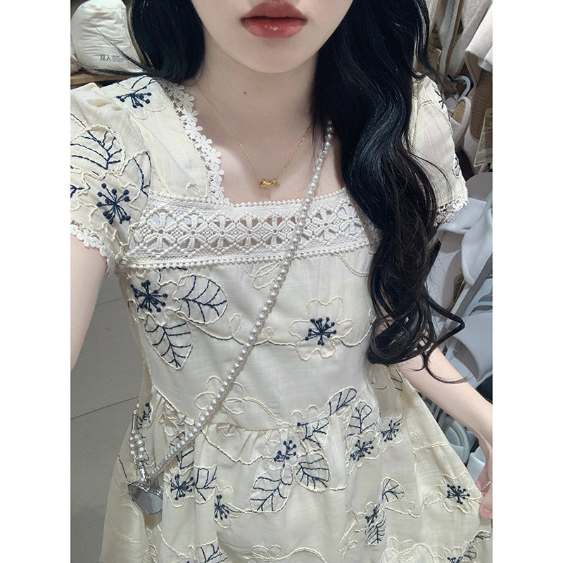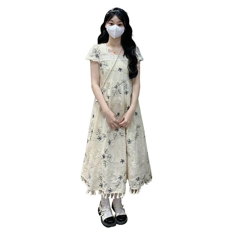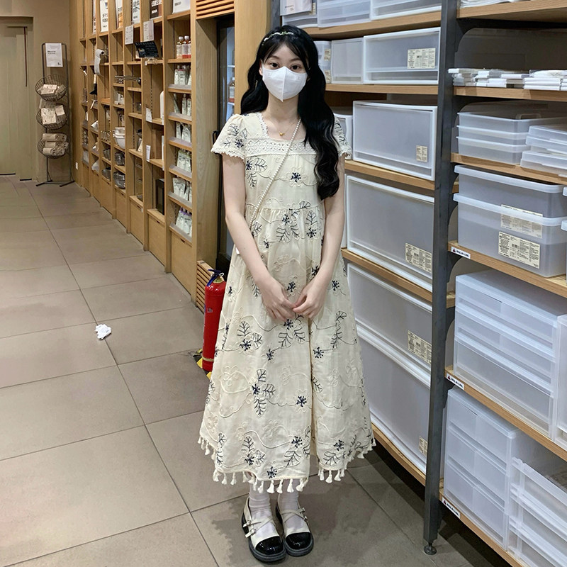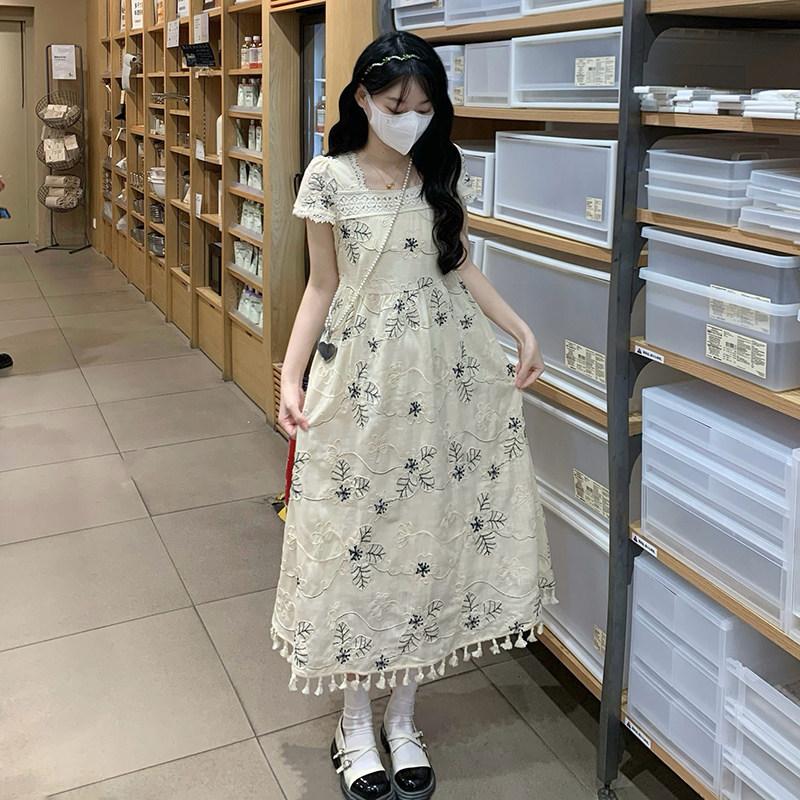 甜美复古小清新方领刺绣连衣裙女大童夏季初中高中生流苏花边长裙