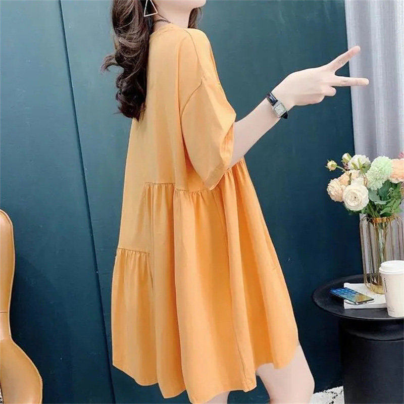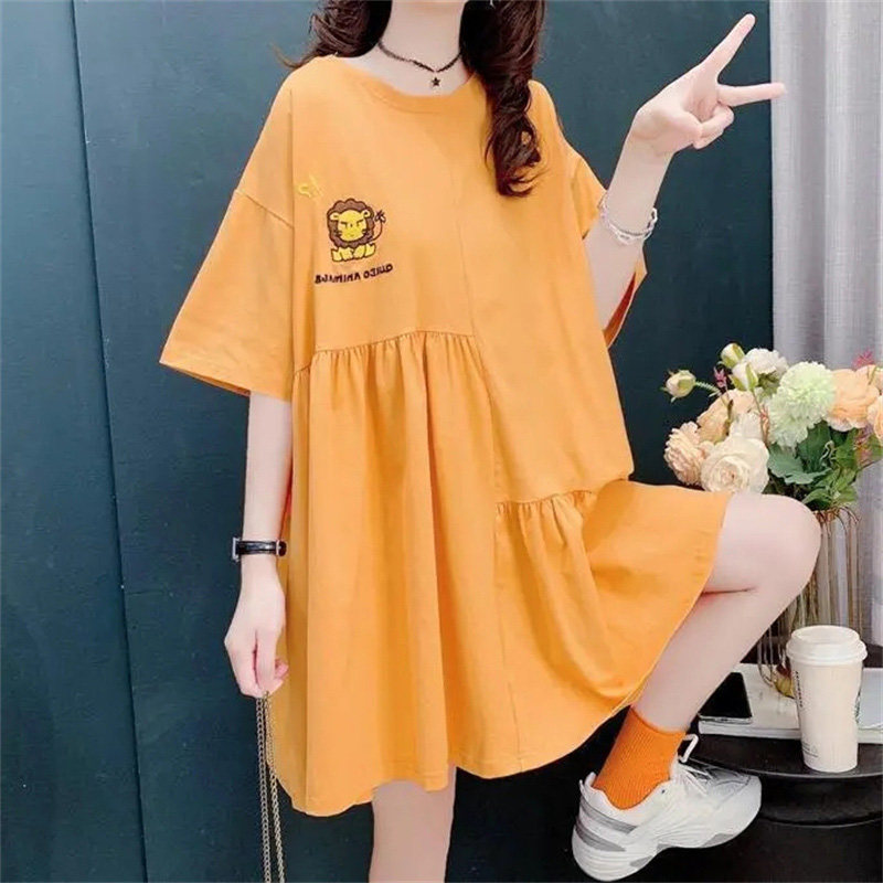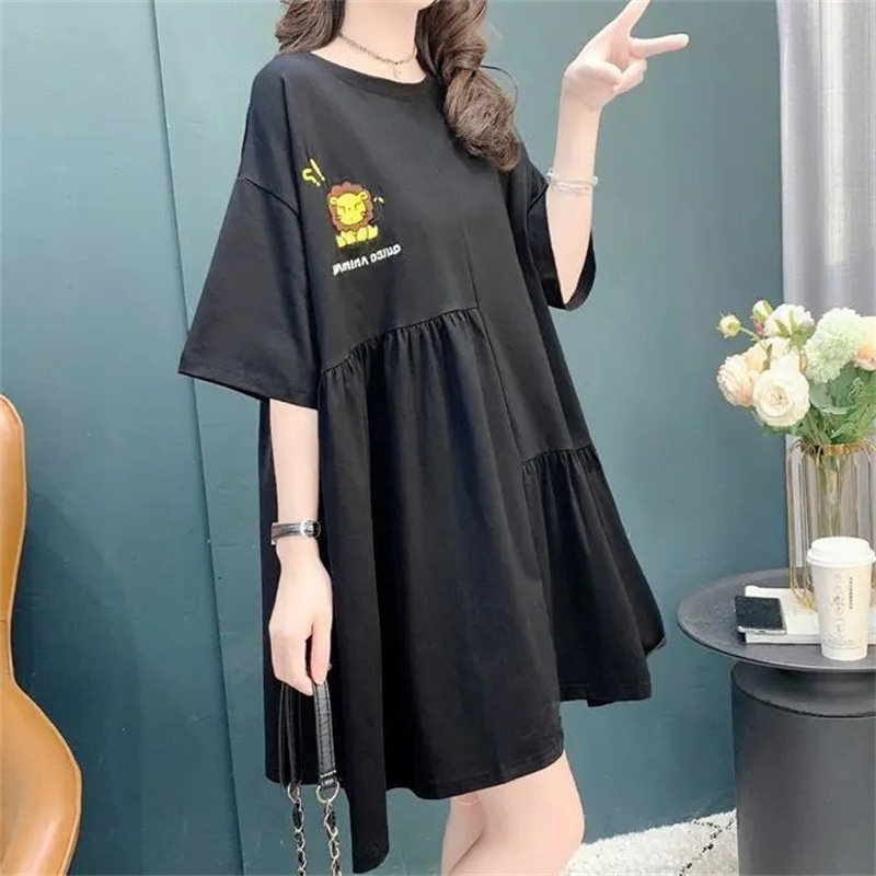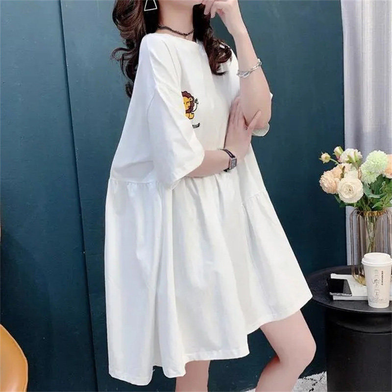 高级感白色短袖T恤连衣裙女夏季胖mm大码遮肚子休闲炸街刺绣裙子