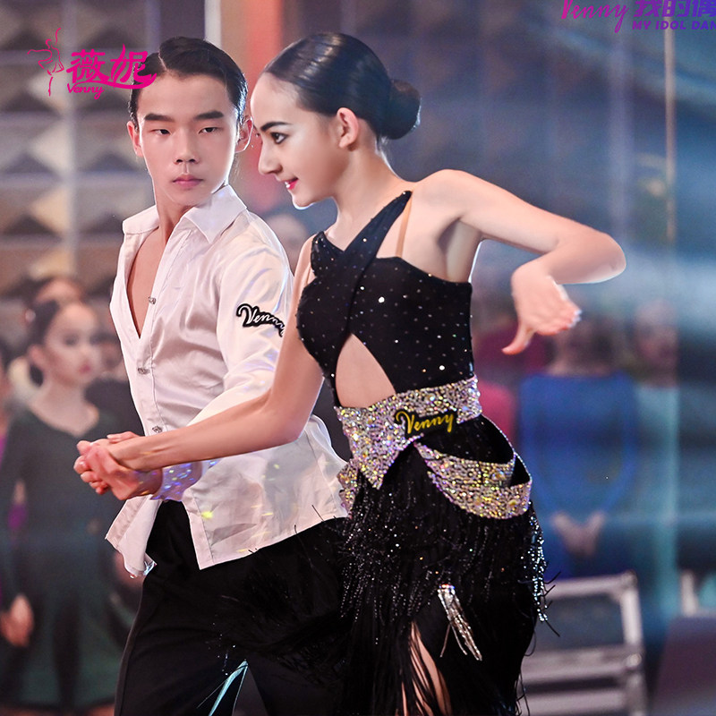 薇妮拉丁舞比赛花服14岁女童表演服交叉V领美背连衣裙流苏演出服