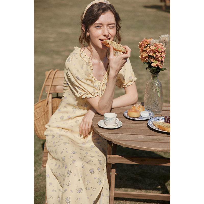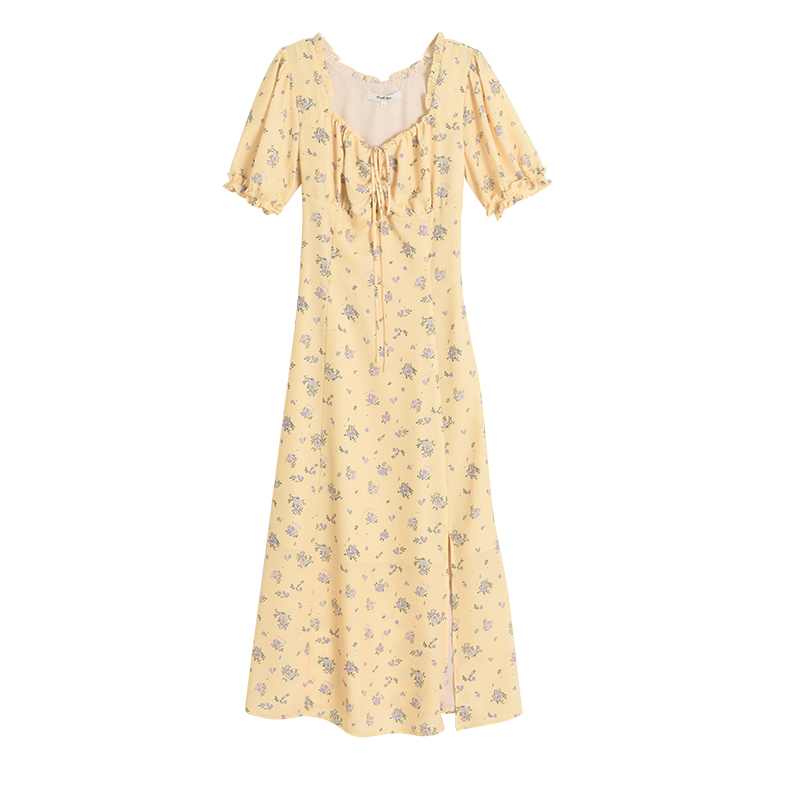 碎花连衣裙女2026年夏新款高腰方领茶歇裙法式收腰绑带长款裙子
