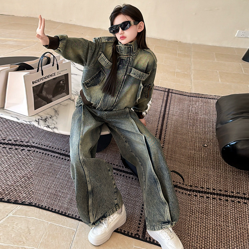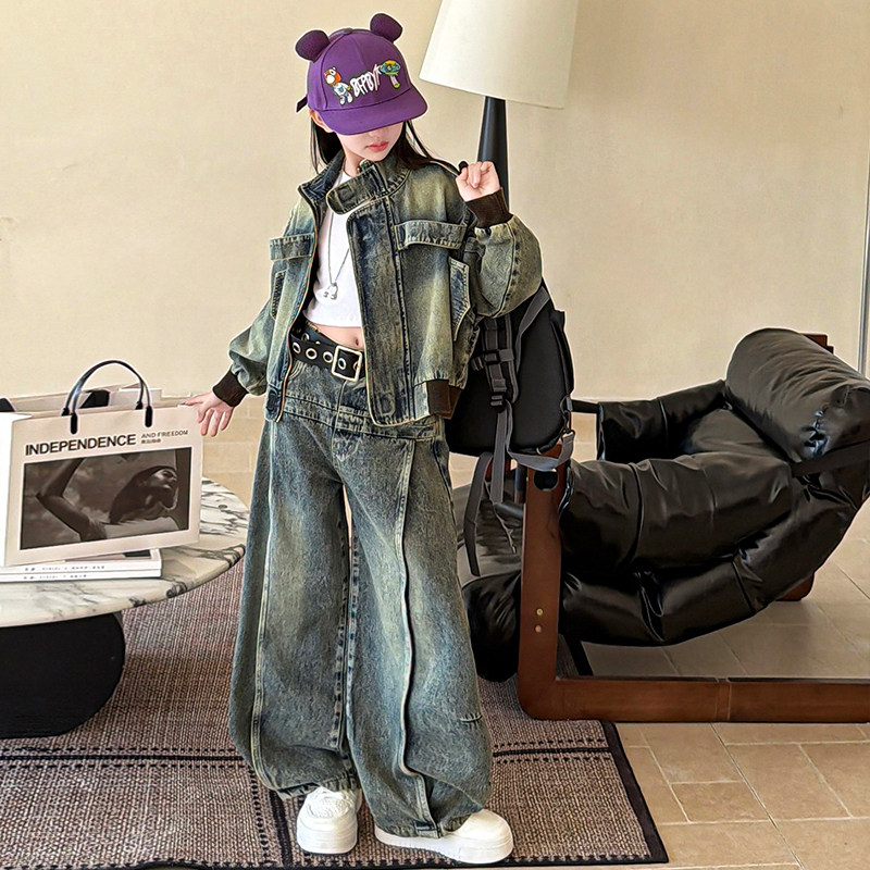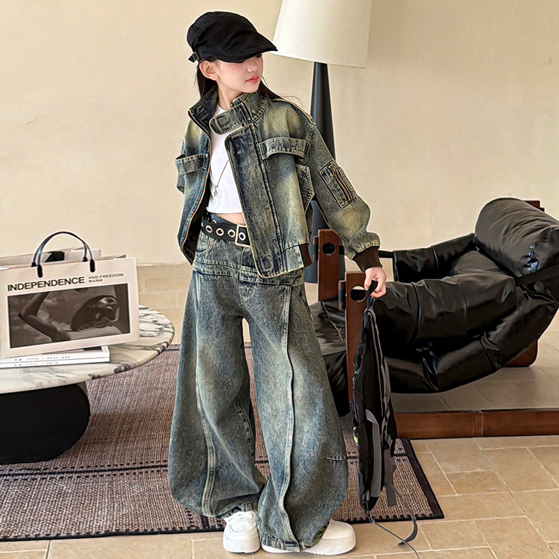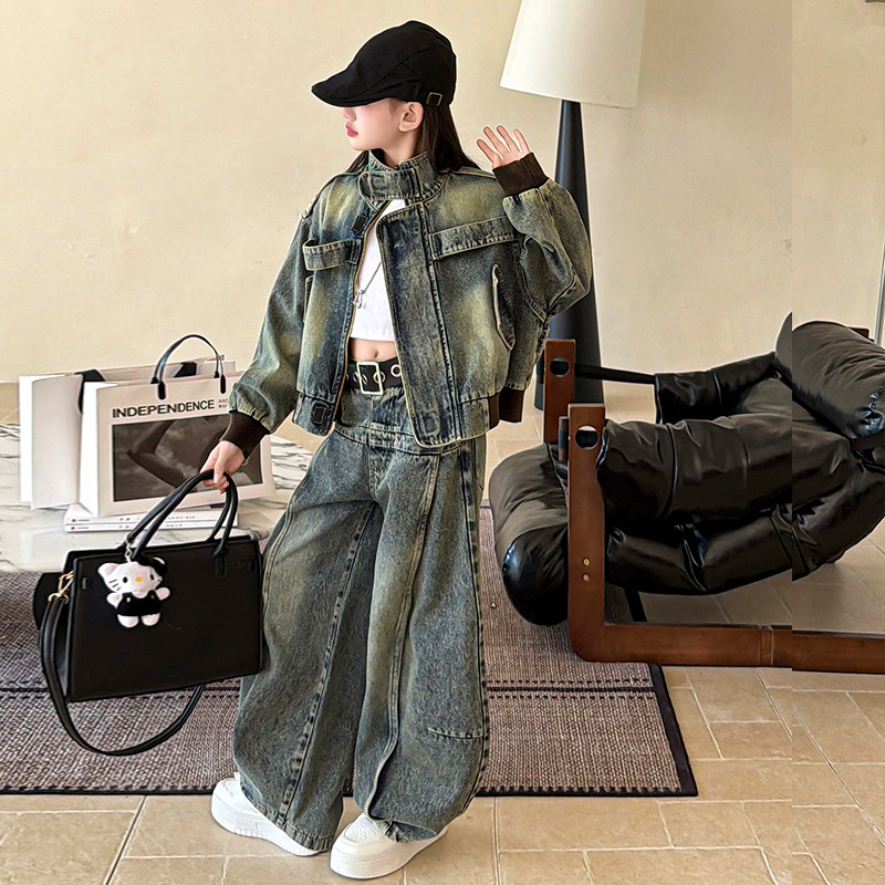 女童春装牛仔套装2026新款中大童复古时髦外套阔腿裤两件套春秋款