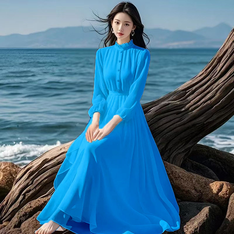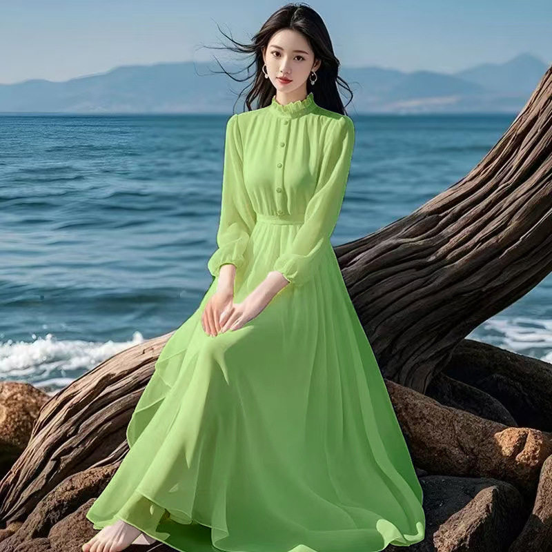 春季新款长袖雪纺衬衫连衣裙女法式高级感气质高腰度假风旅游长裙