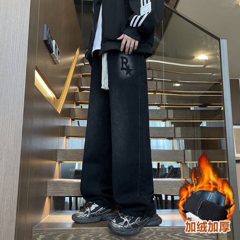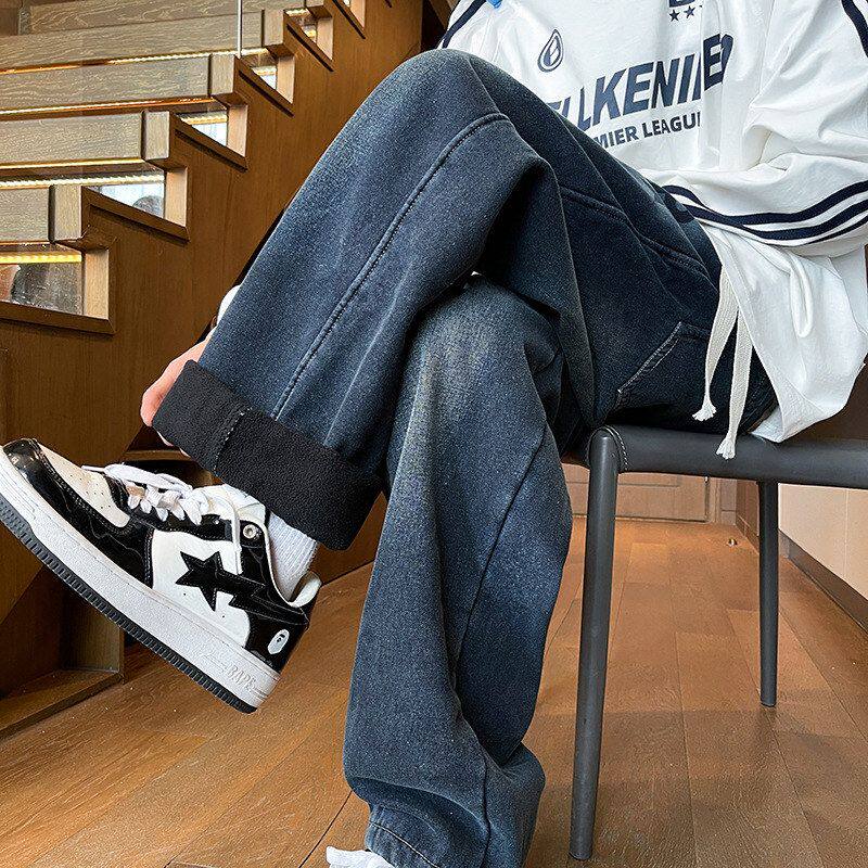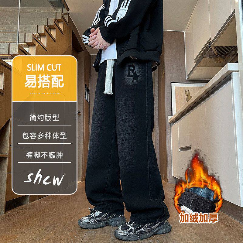 冬季加绒牛仔裤男初中高中学生直筒休闲裤青少年帅气大童加厚裤子
