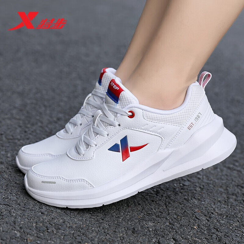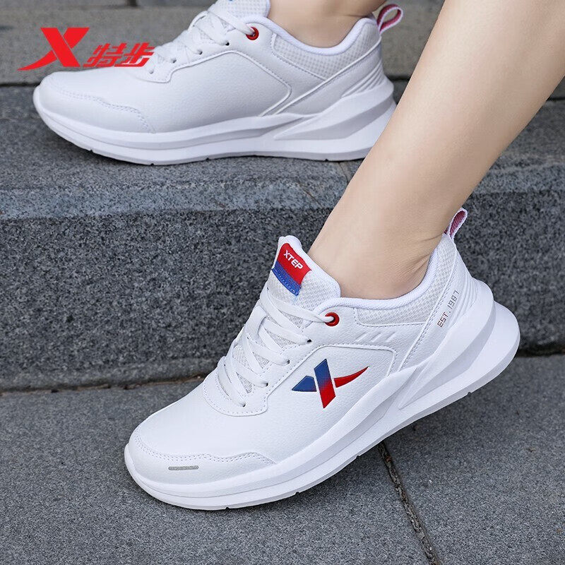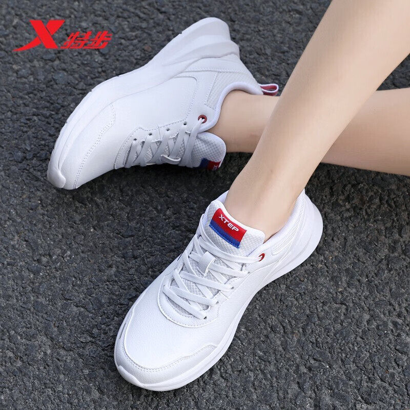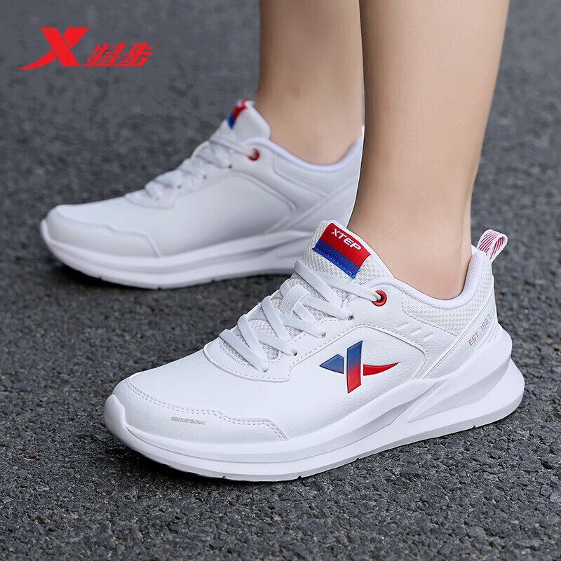 特步女鞋跑步鞋夏季轻便软底鞋子小白鞋官方旗舰皮面防水运动鞋女