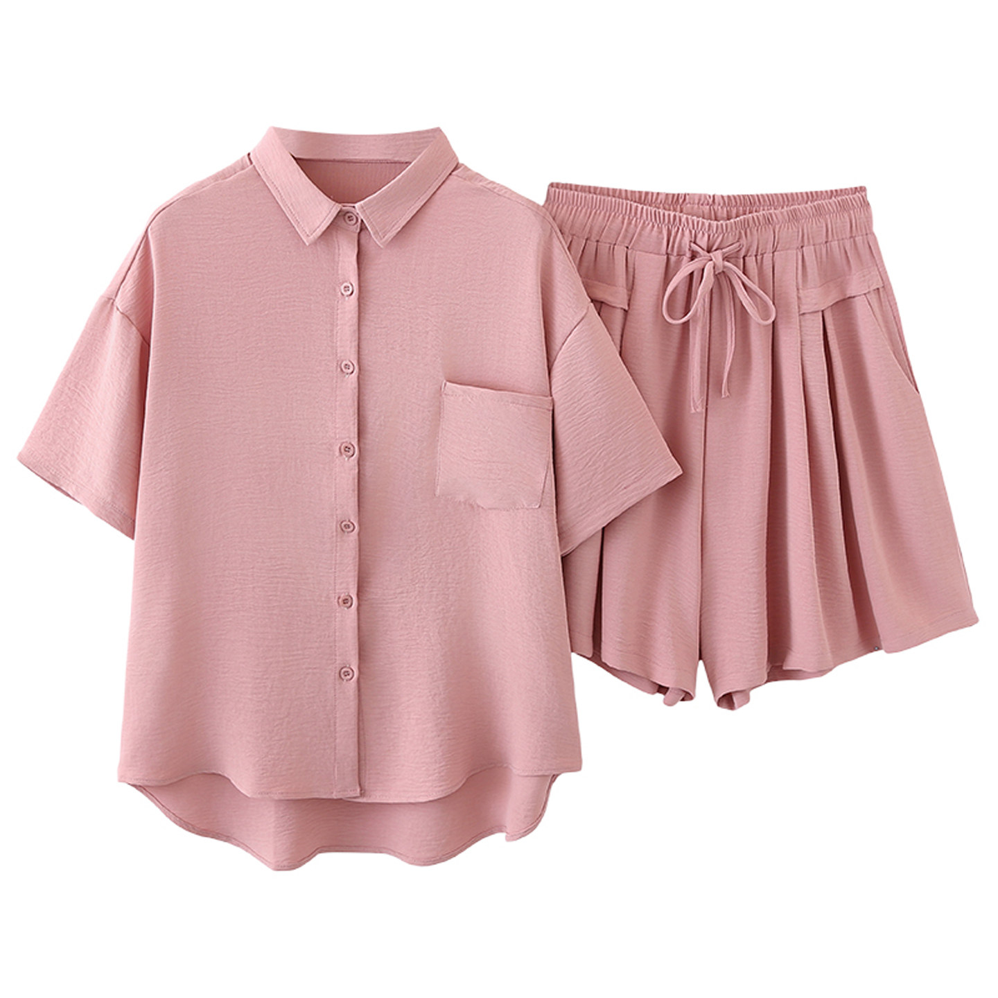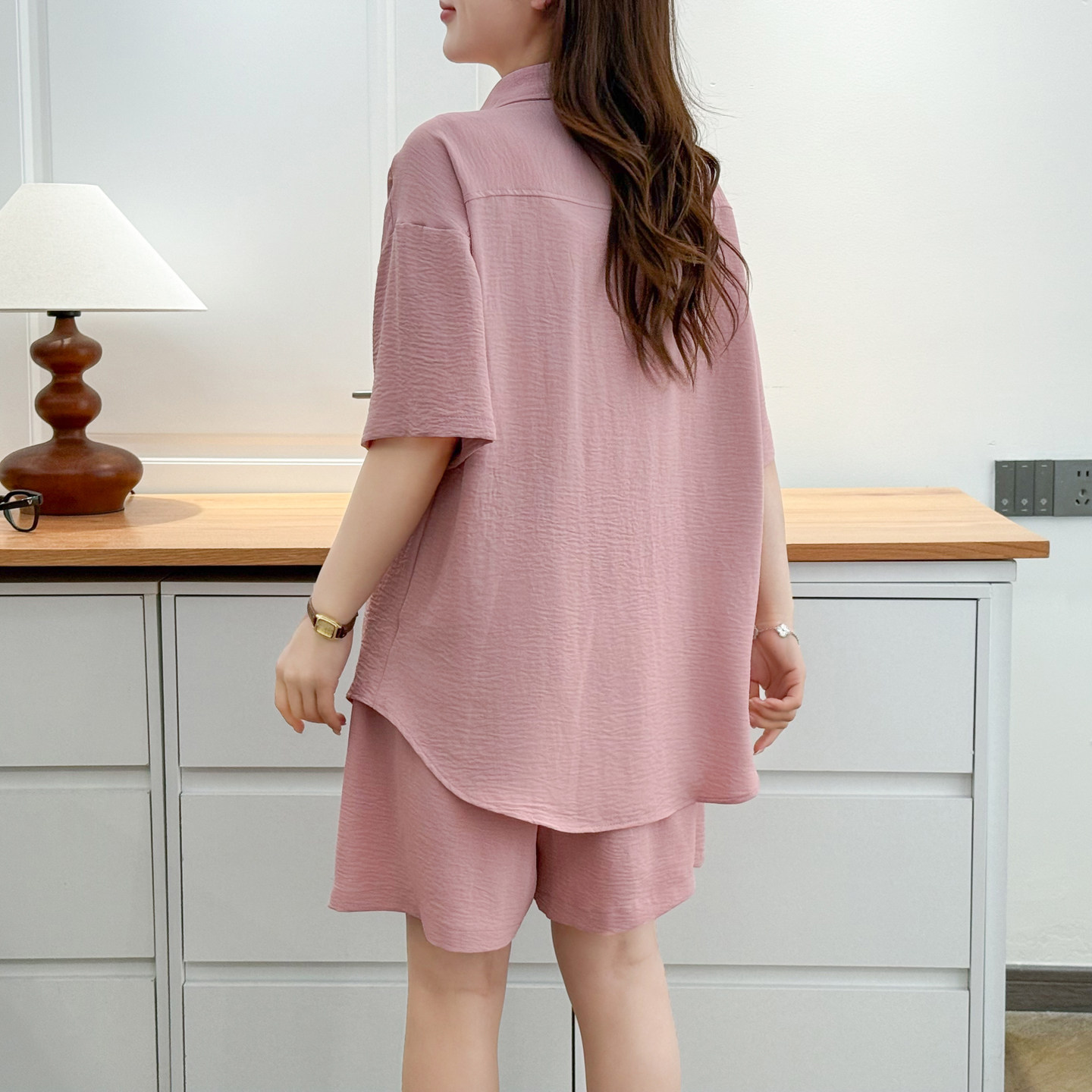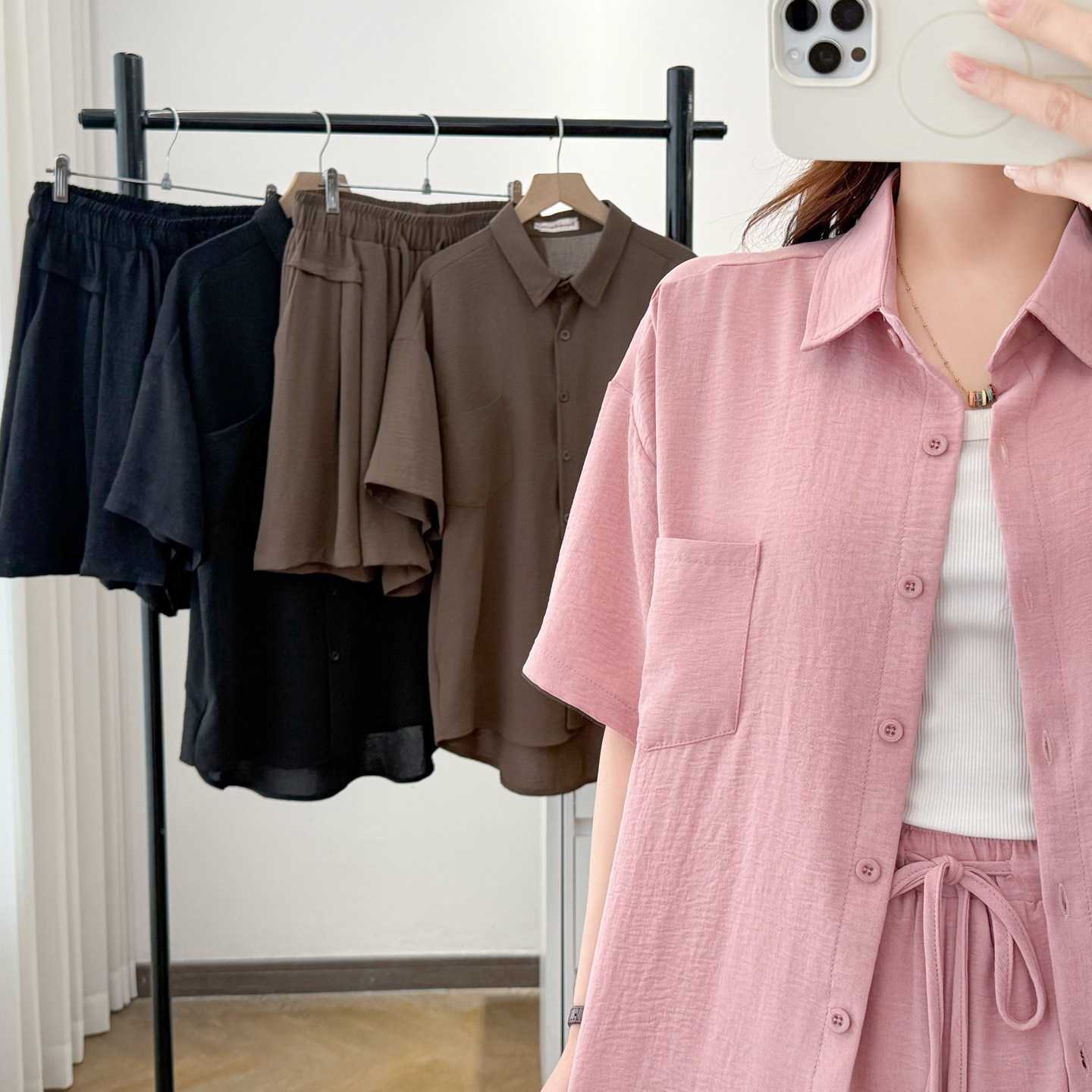 短袖短裤宽松套装大码女胖mm200斤夏装2026新款纯色半袖衬衫+裤裙