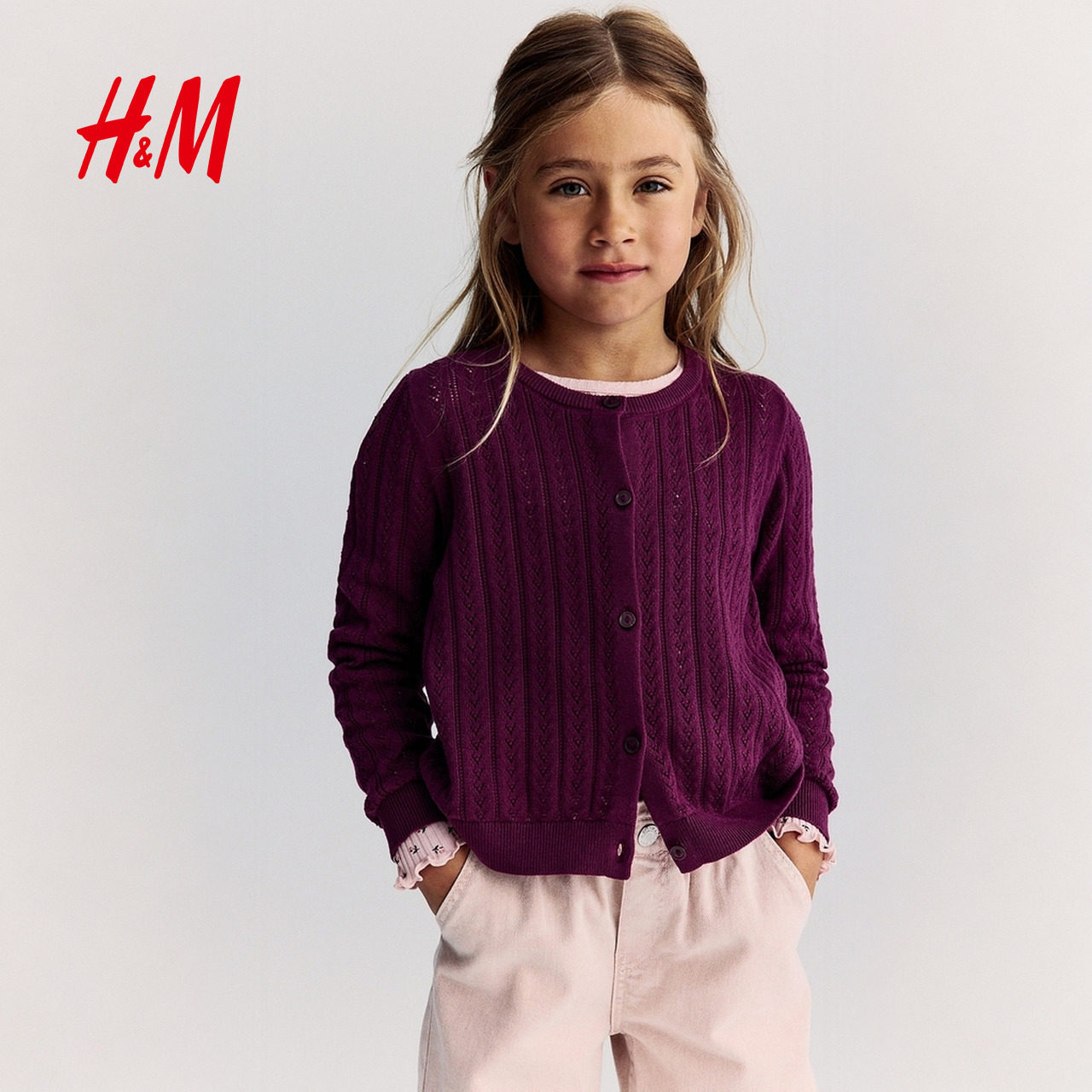 HM童装女童毛衣春季棉质内搭针织衫梅红色打底开衫1273021