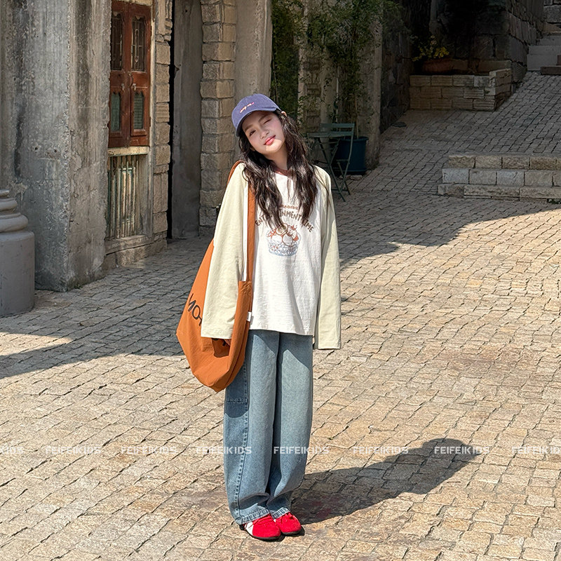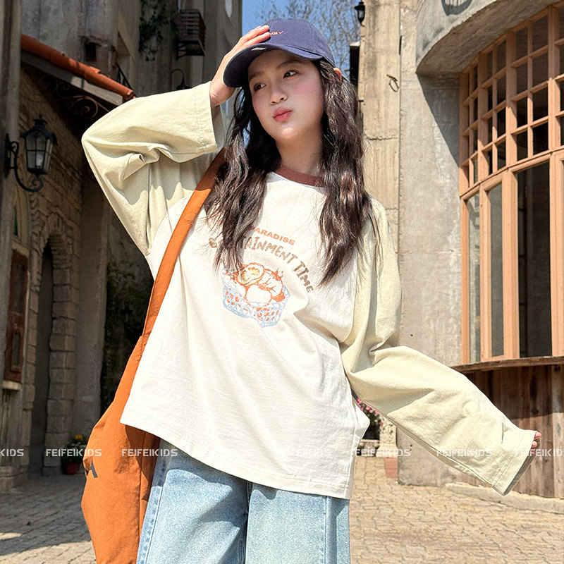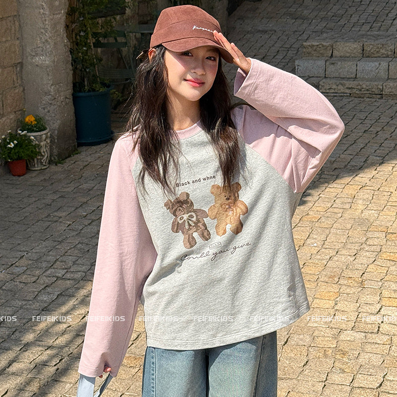 女童撞色长袖T恤2026春新款青少年宽松洋气插肩袖打底衫洋气上衣
