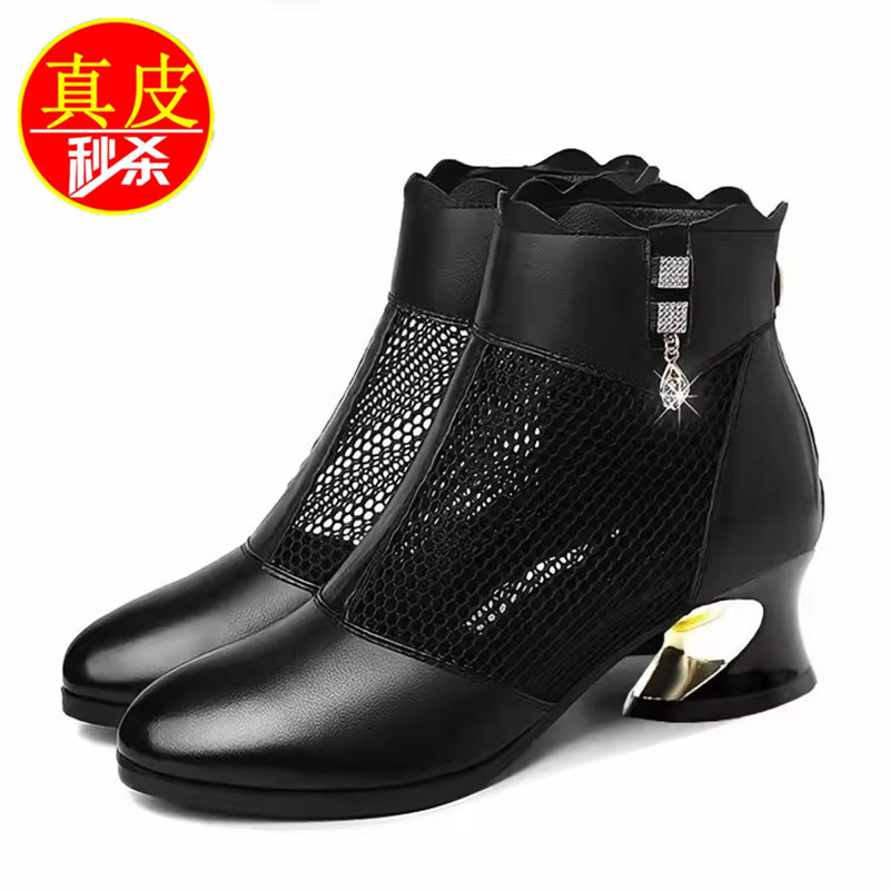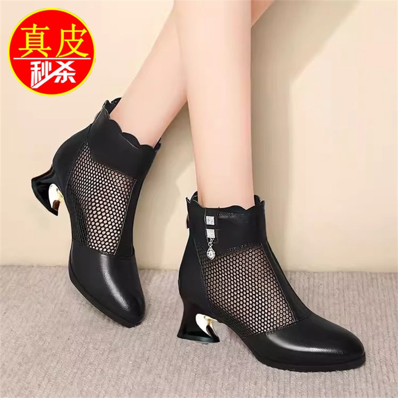 品牌撤柜真皮网纱马丁靴夏季薄款女鞋2026网面镂空凉靴粗跟网靴