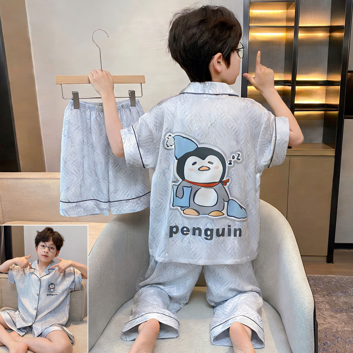 311线报网描述:男童冰丝短袖薄款夏季中大童卡通小新家居服