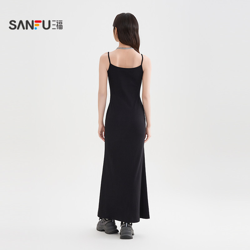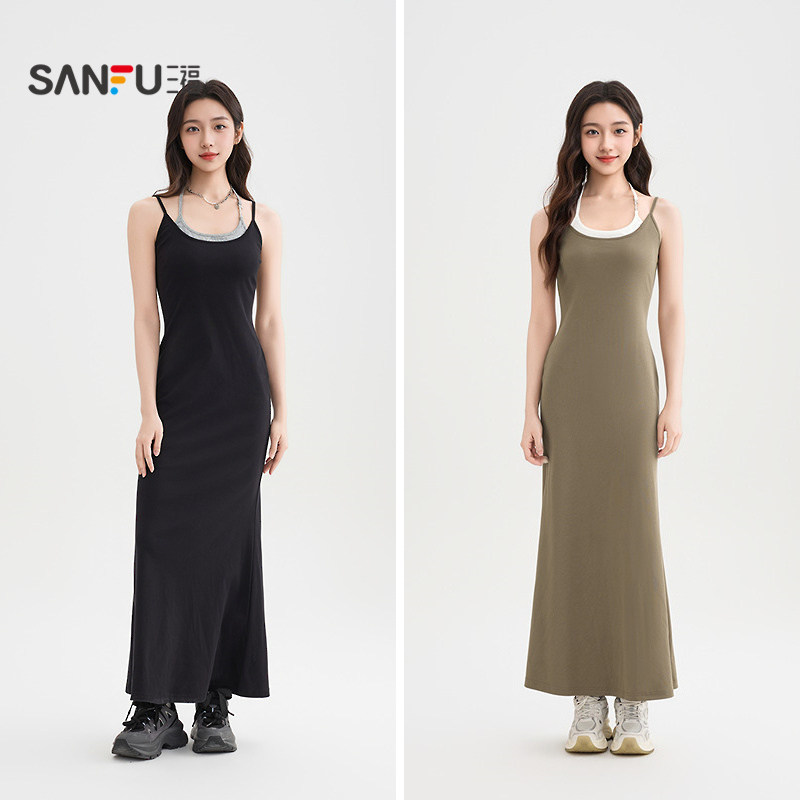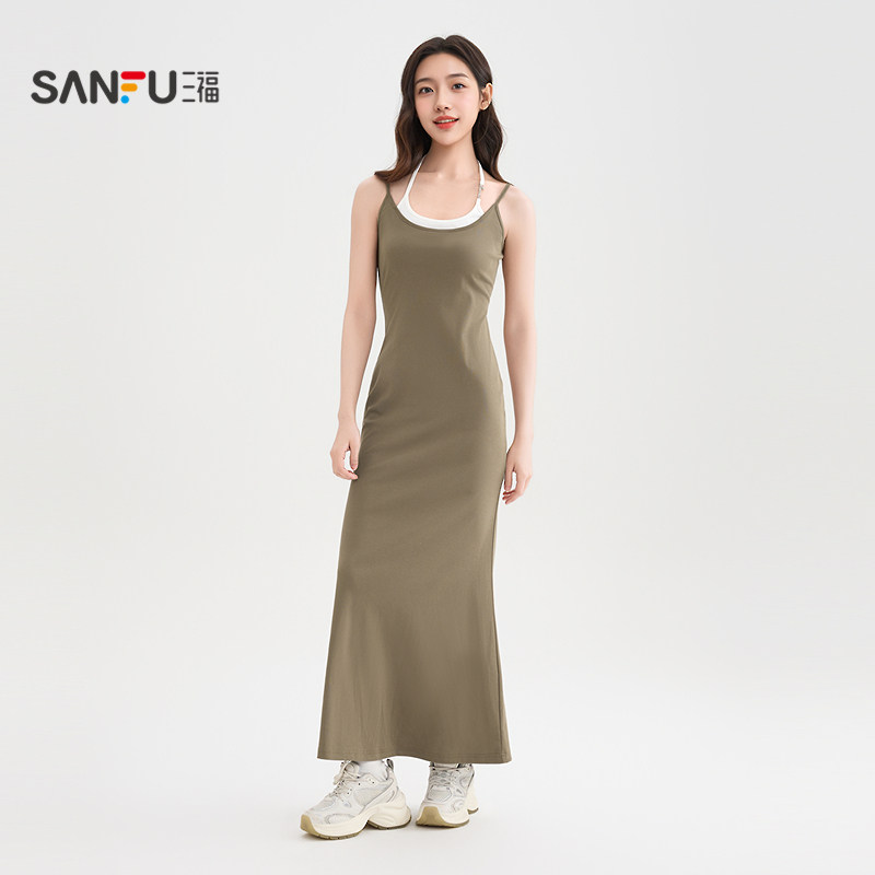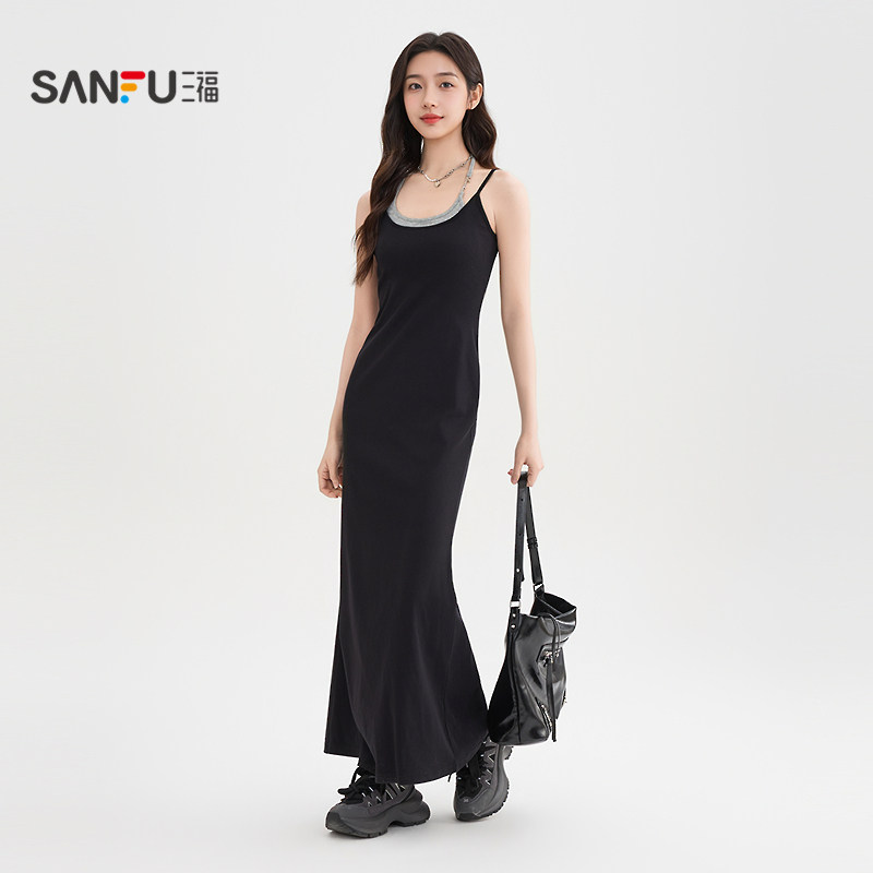 三福吊带连衣裙女2026新款夏季挂脖假两件修身显瘦鱼尾长裙子女装