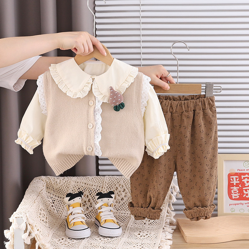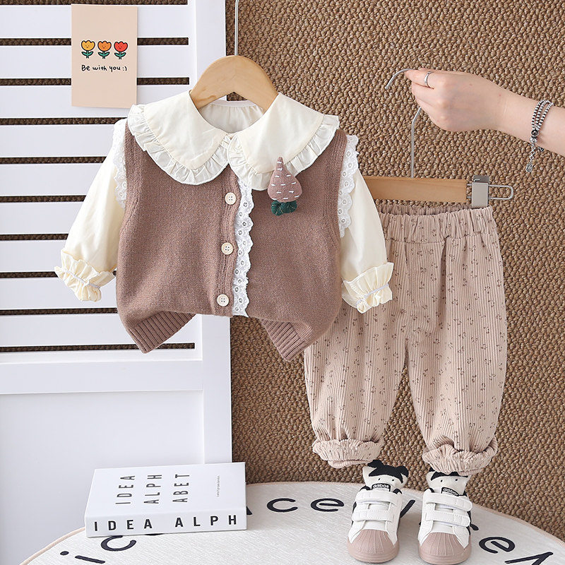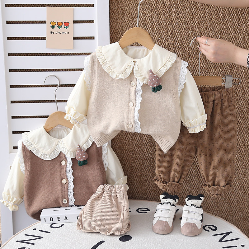 女童春秋装套装2025新款洋气爆款婴幼儿女宝宝休闲毛衣马甲三件套