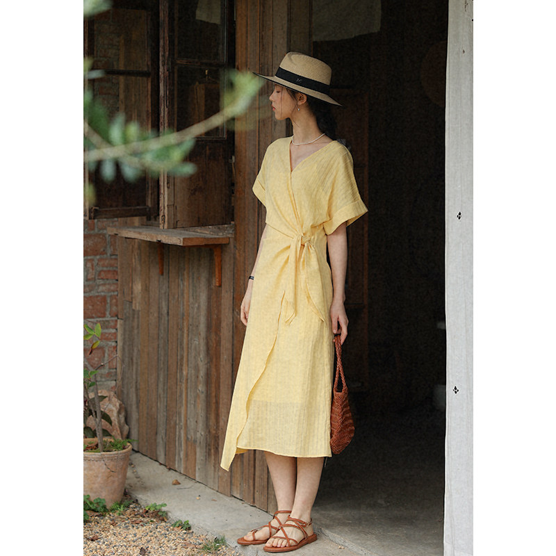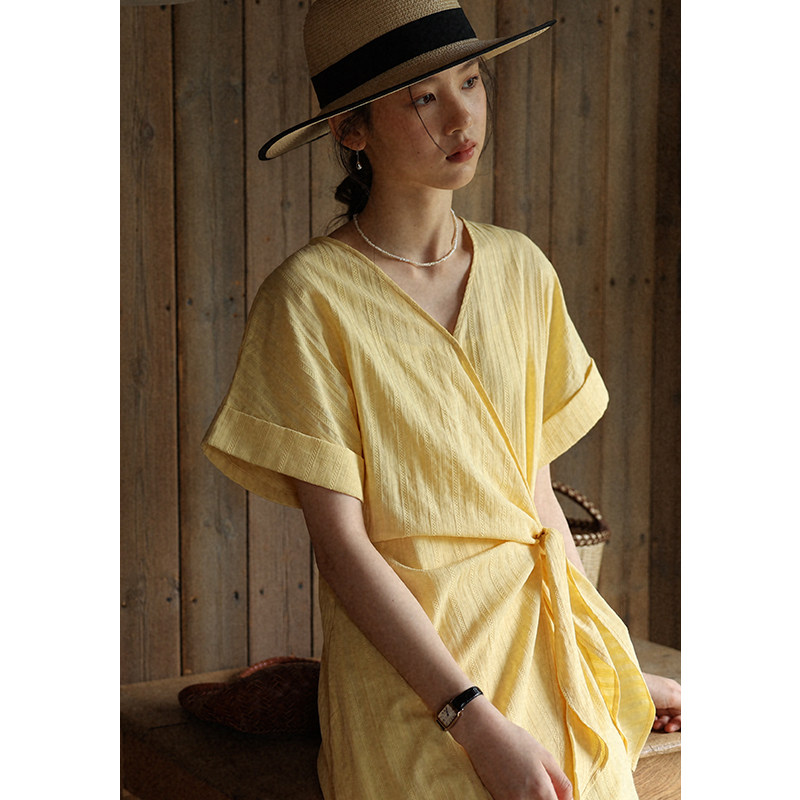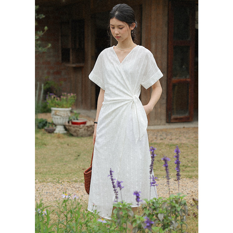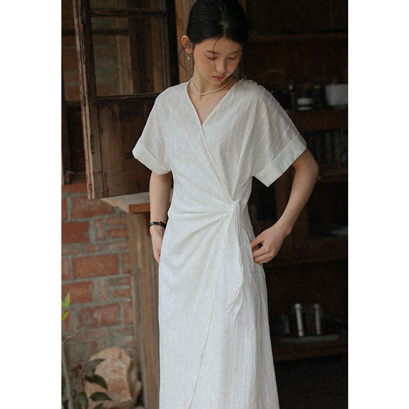 无拘春夏新款日常通勤精致V领女裙H版型长裙绑带肌理设计感连衣裙