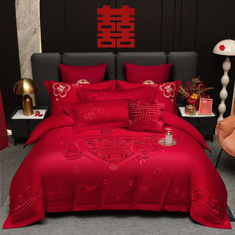 婚庆四件套大红色全棉刺绣新婚喜被套件纯棉婚房绣花结婚床上用品