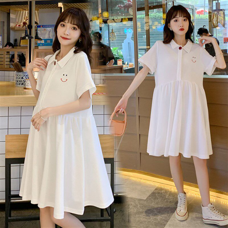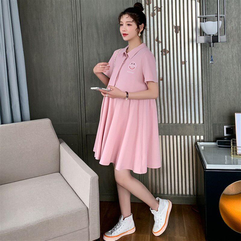 大码孕妇连衣裙夏装中长款翻领怀孕期可爱短袖纯棉宽松裙子200斤