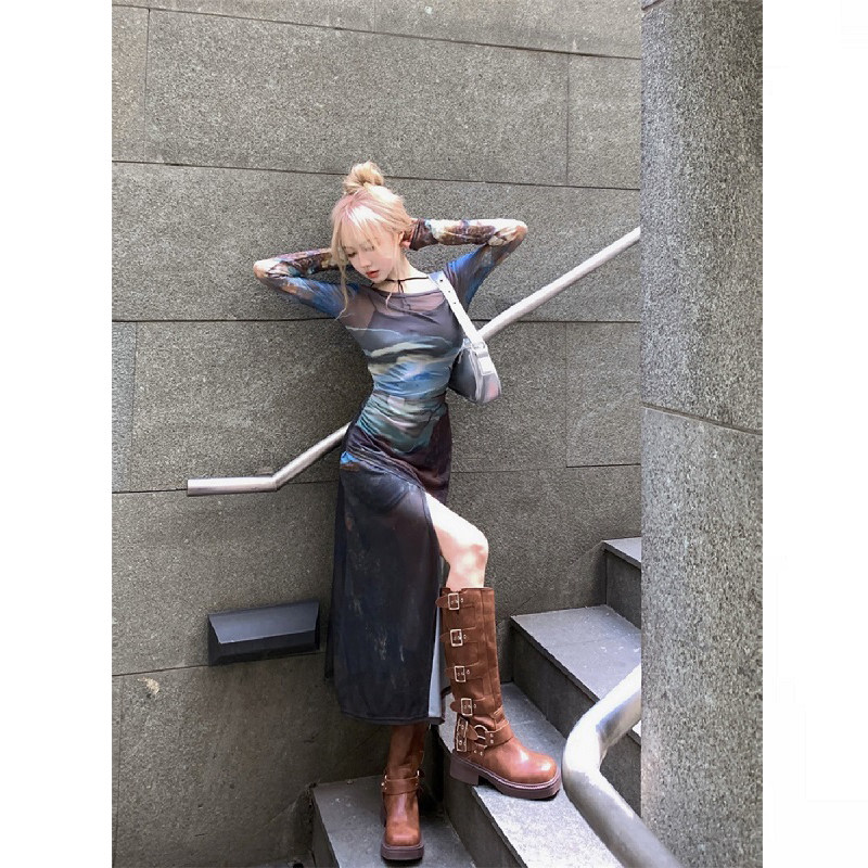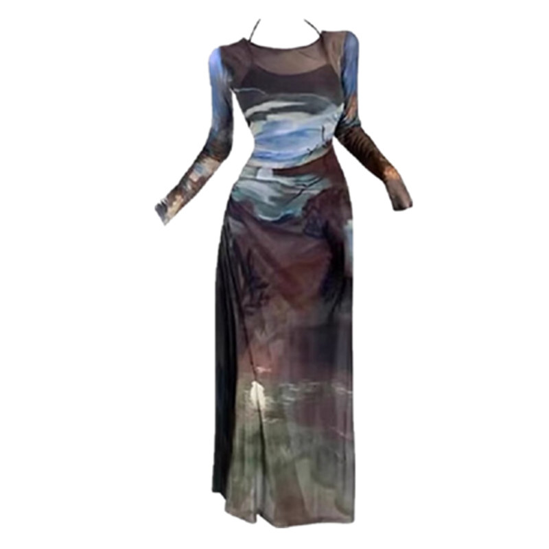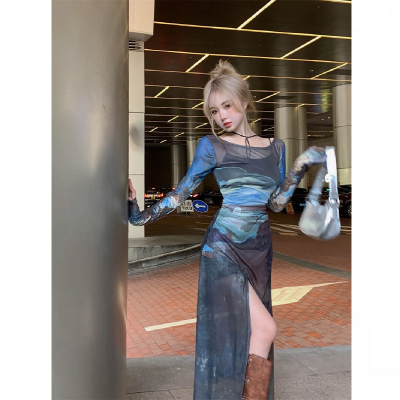 大码胖mm复古开叉收腰网纱吊带连衣裙女春夏辣妹显瘦长裙两件套装