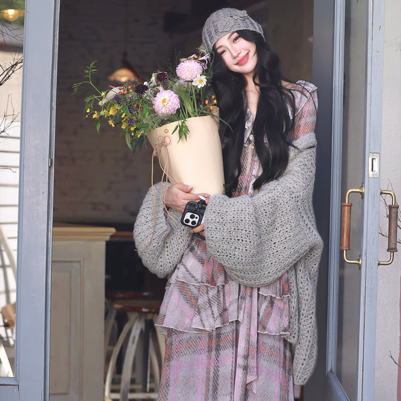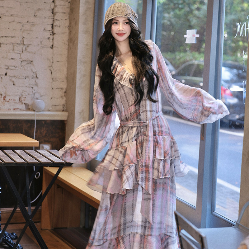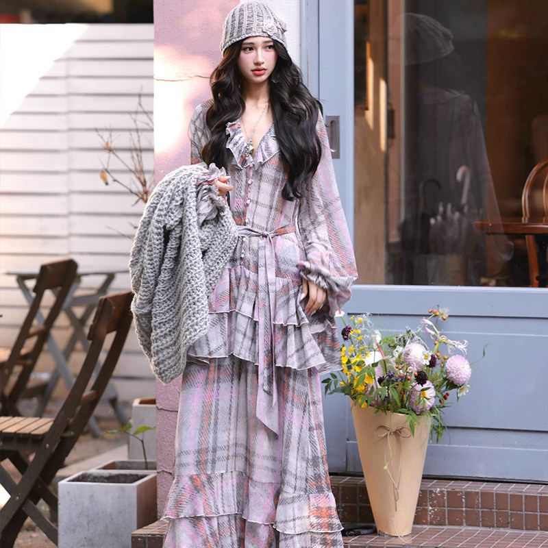 AZure温柔风荷叶边连衣裙法式复古粉灰格长袖百搭衬衫裙宽松显瘦