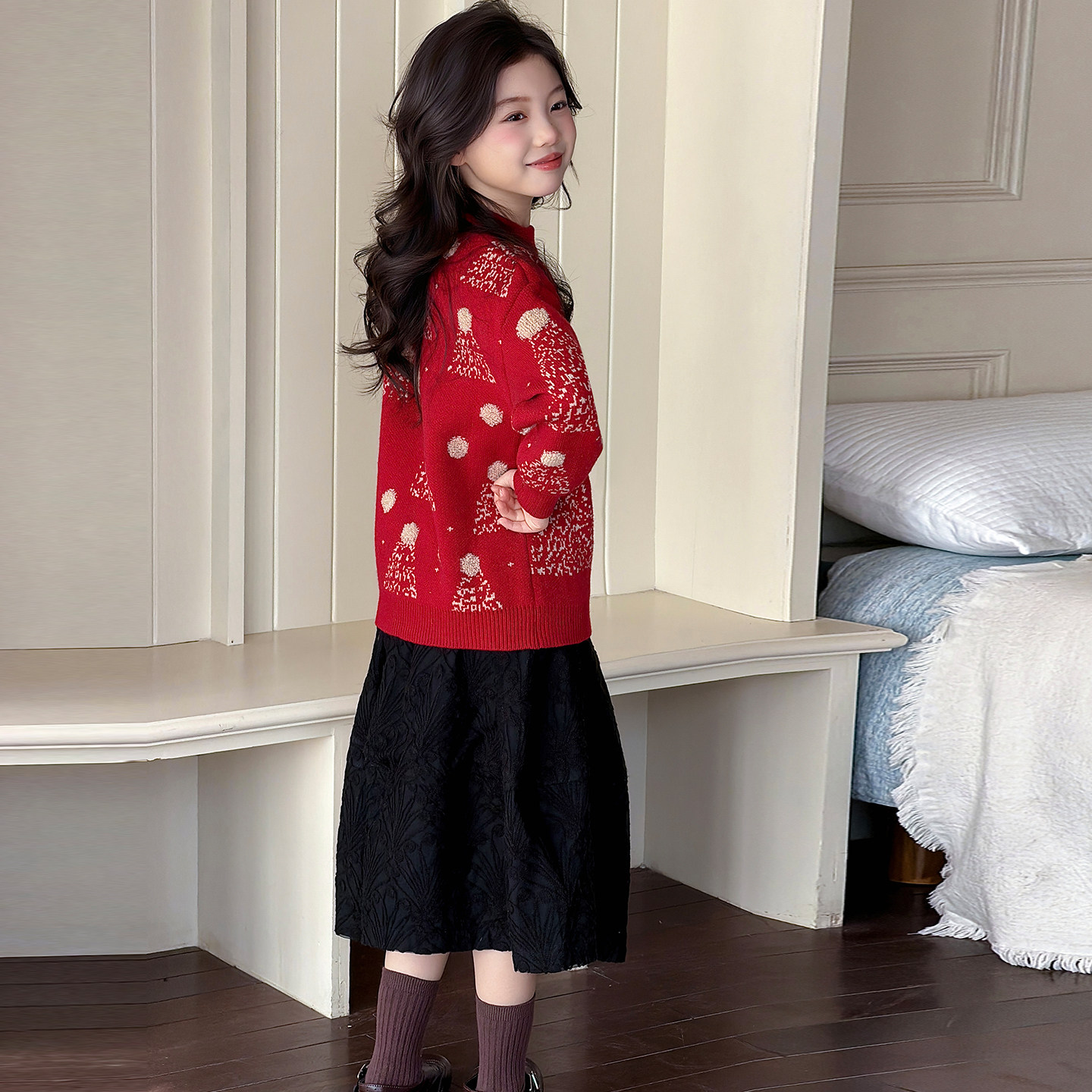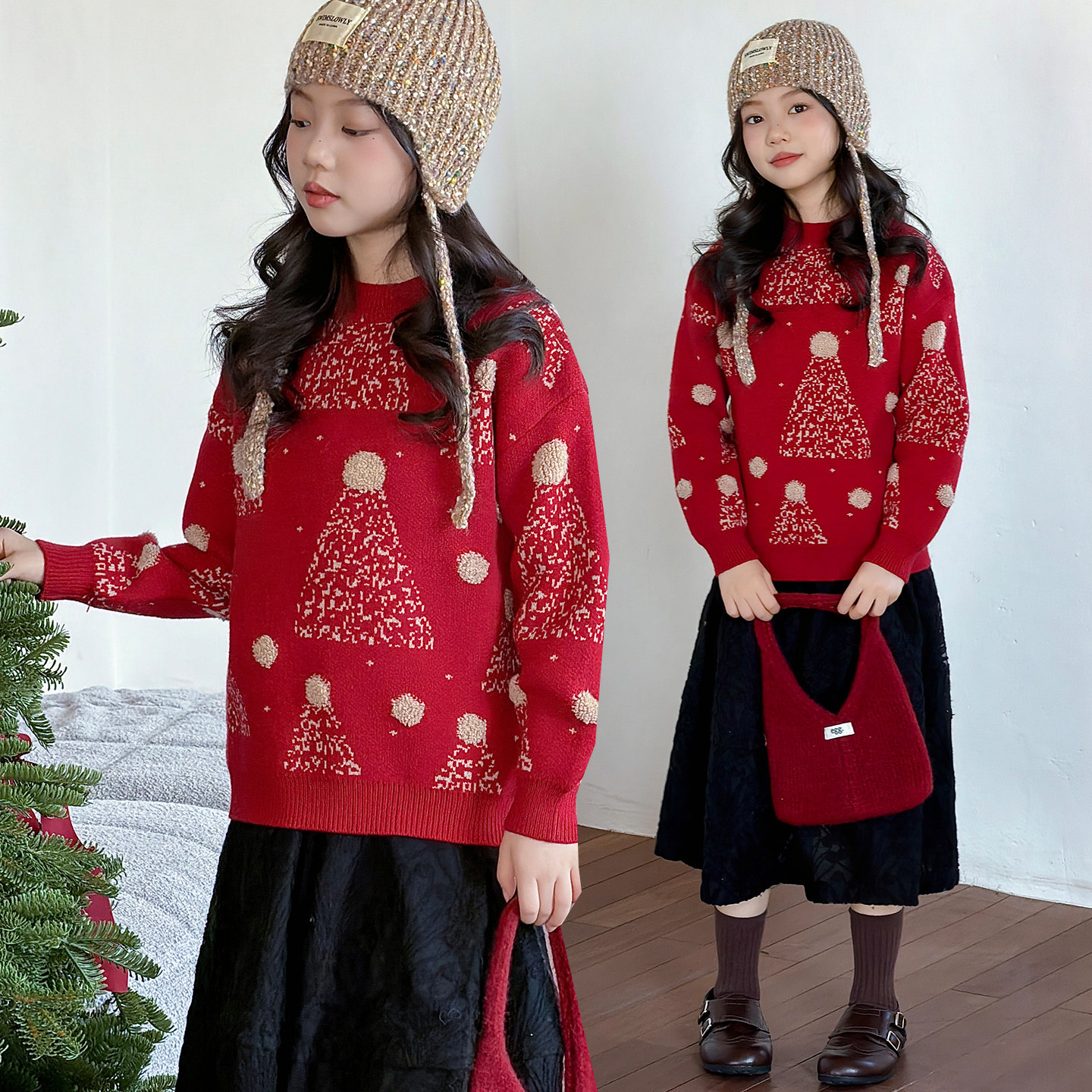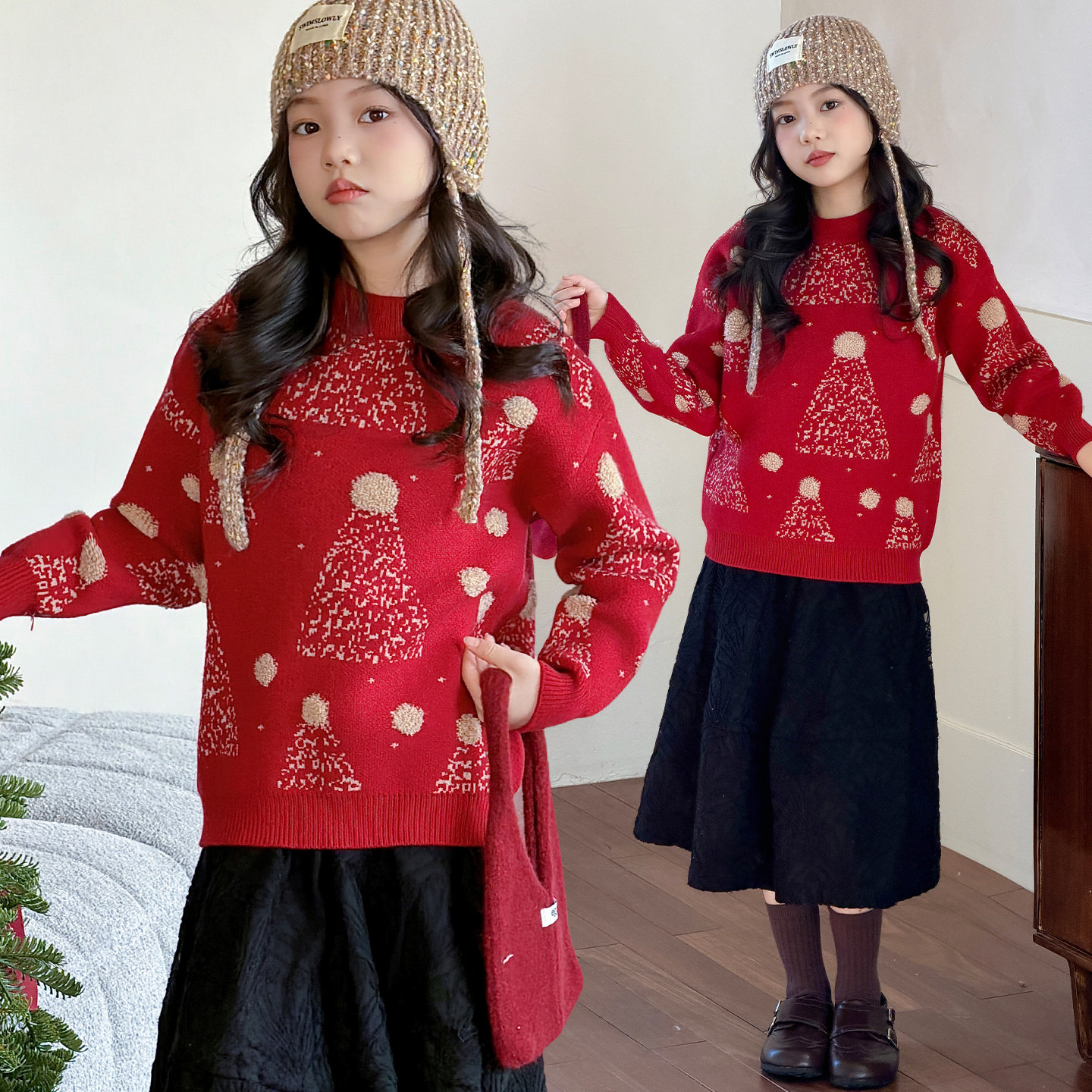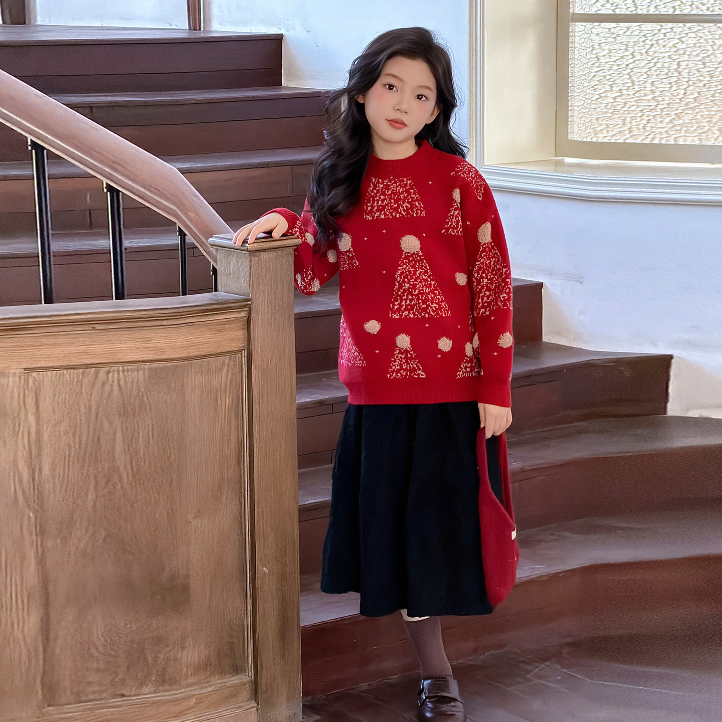 儿童圣诞风红色毛衣女童新年针织衫加厚保暖套头上衣可外穿内搭冬
