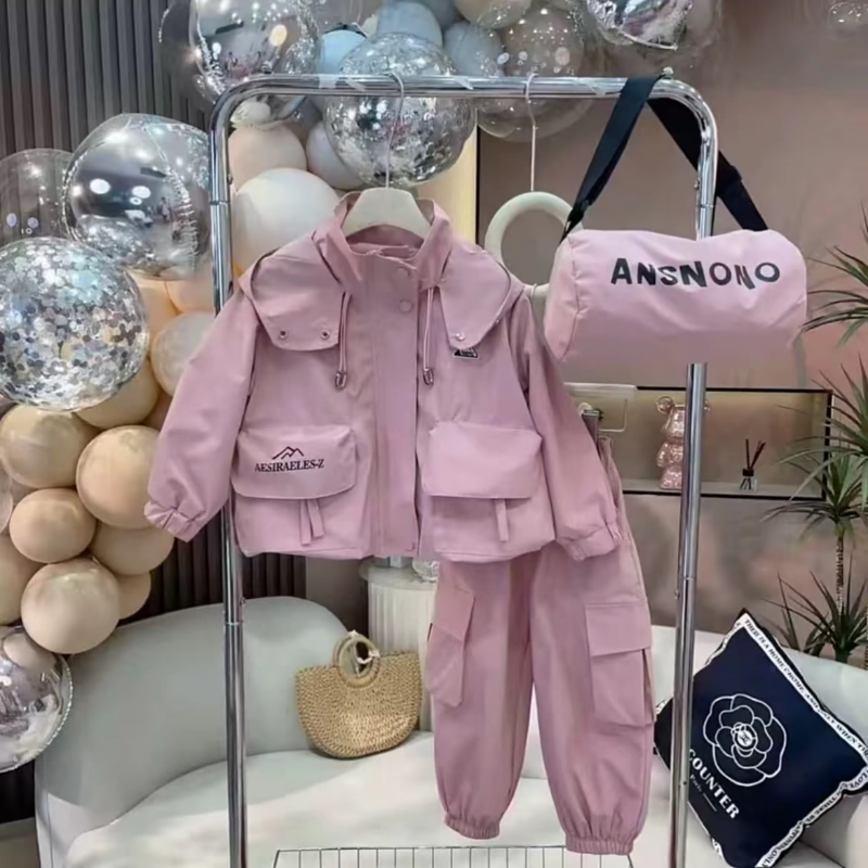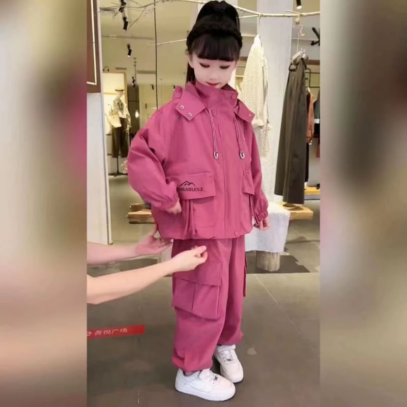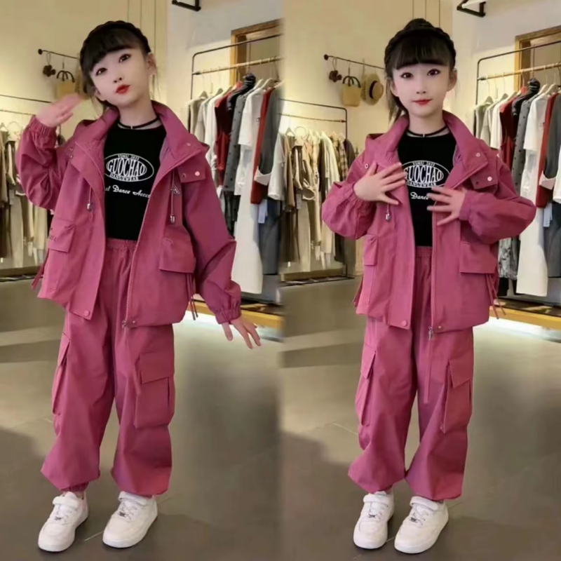 女童韩版连帽冲锋衣运动套装春秋新款时髦网红小女孩工装裤两件套