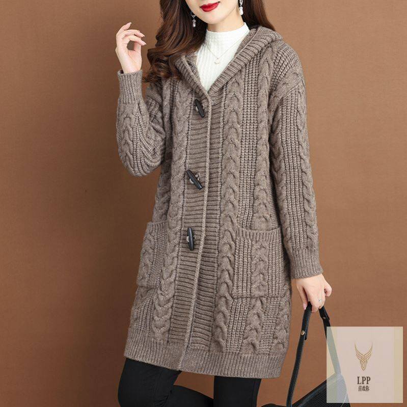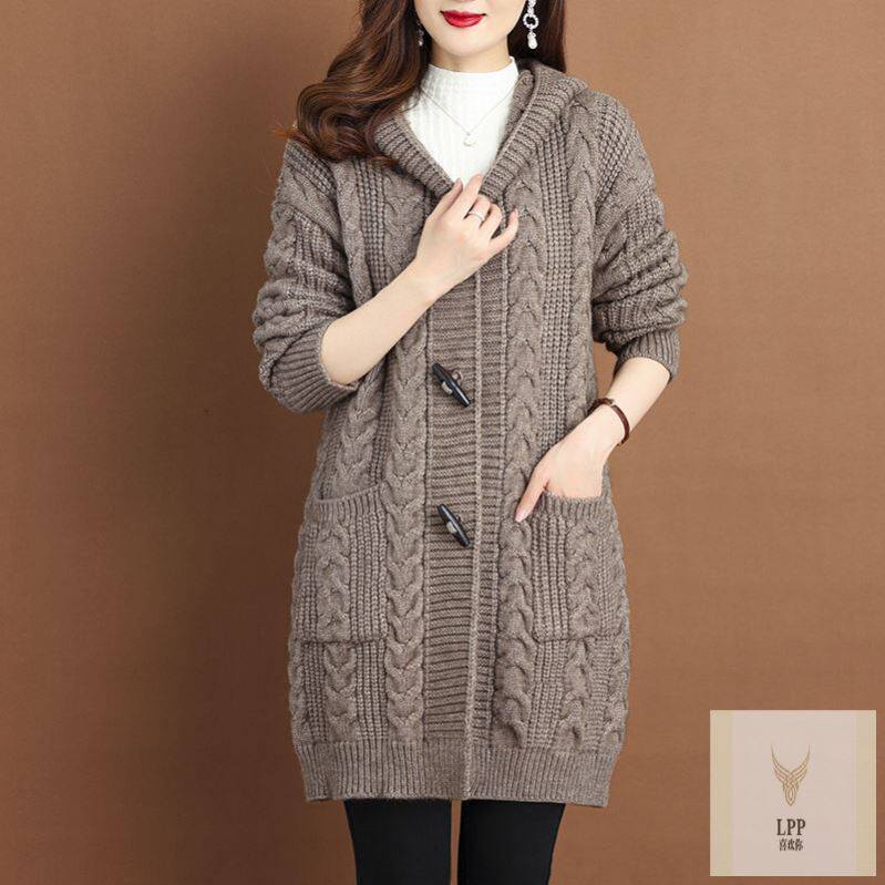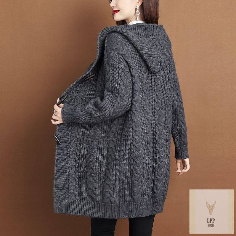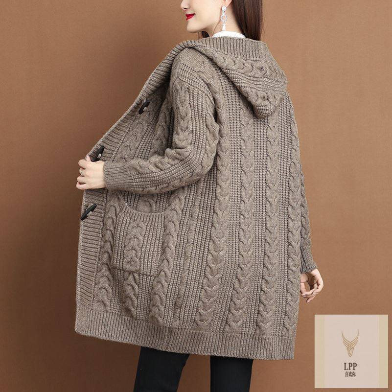 清仓秋冬加厚毛衣洋气针织外搭女开衫中长款连帽胖mm大码外套