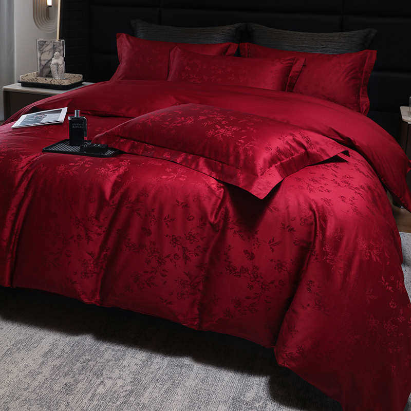 轻奢风婚庆四件套100S长绒棉提花被套酒红色纯棉床单结婚床上用品