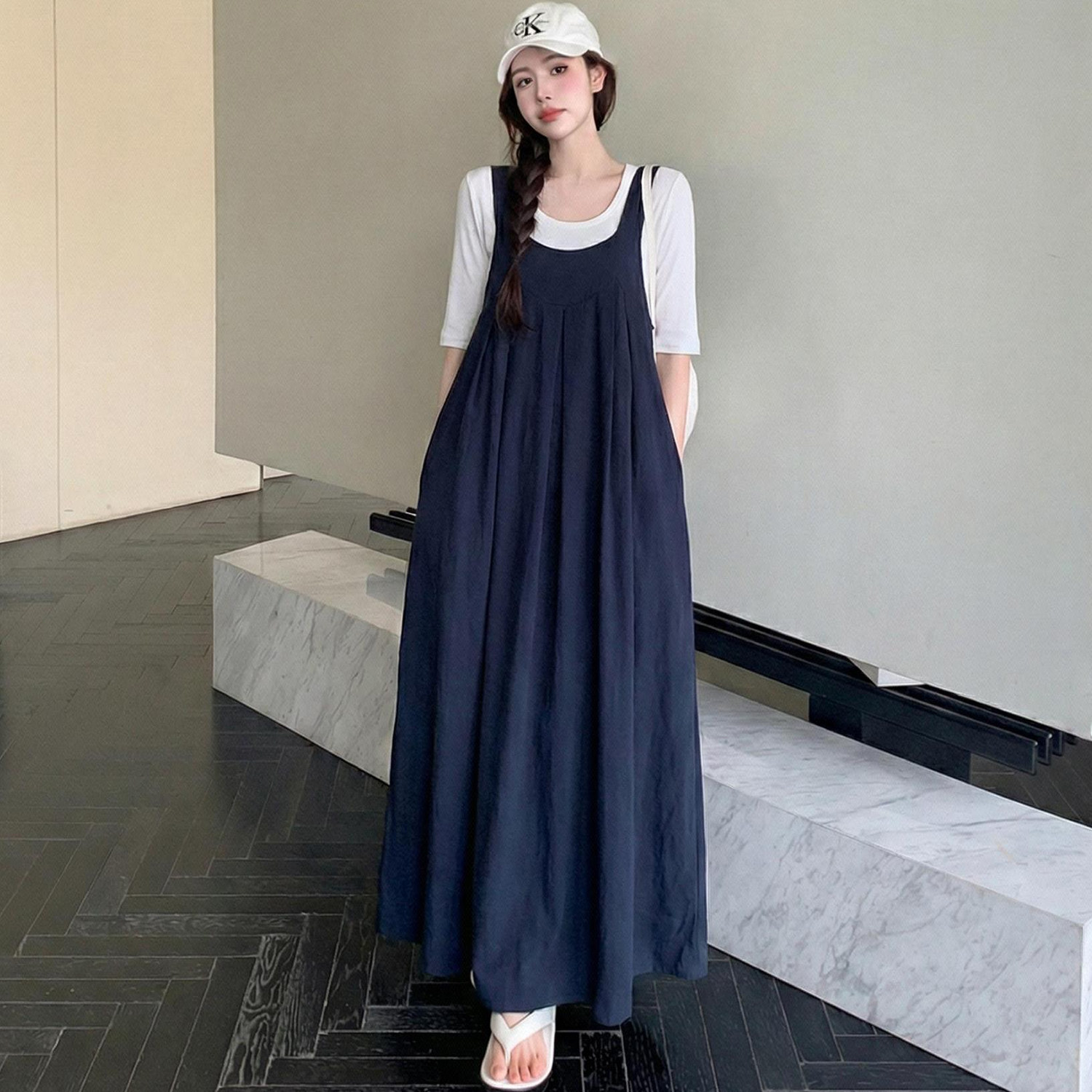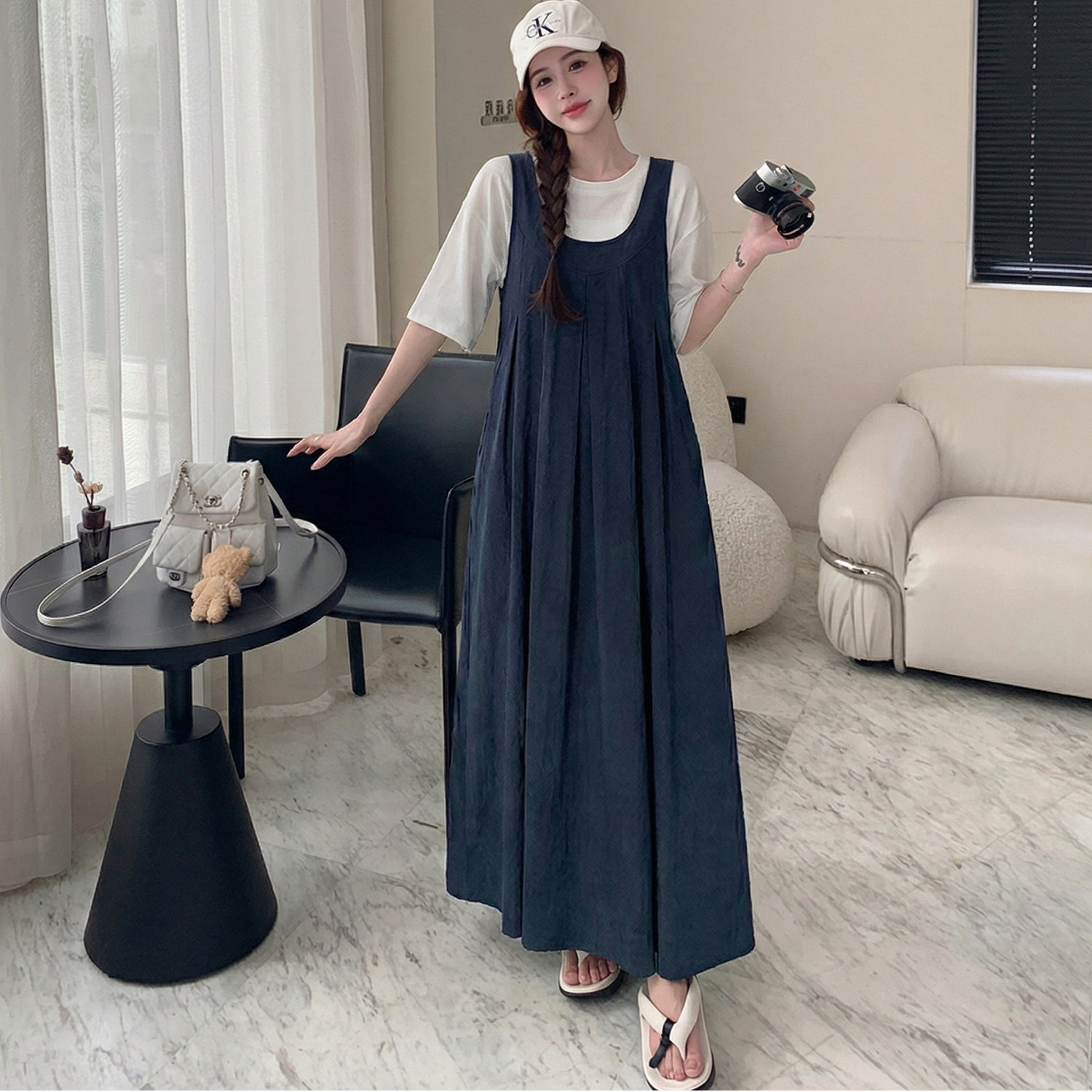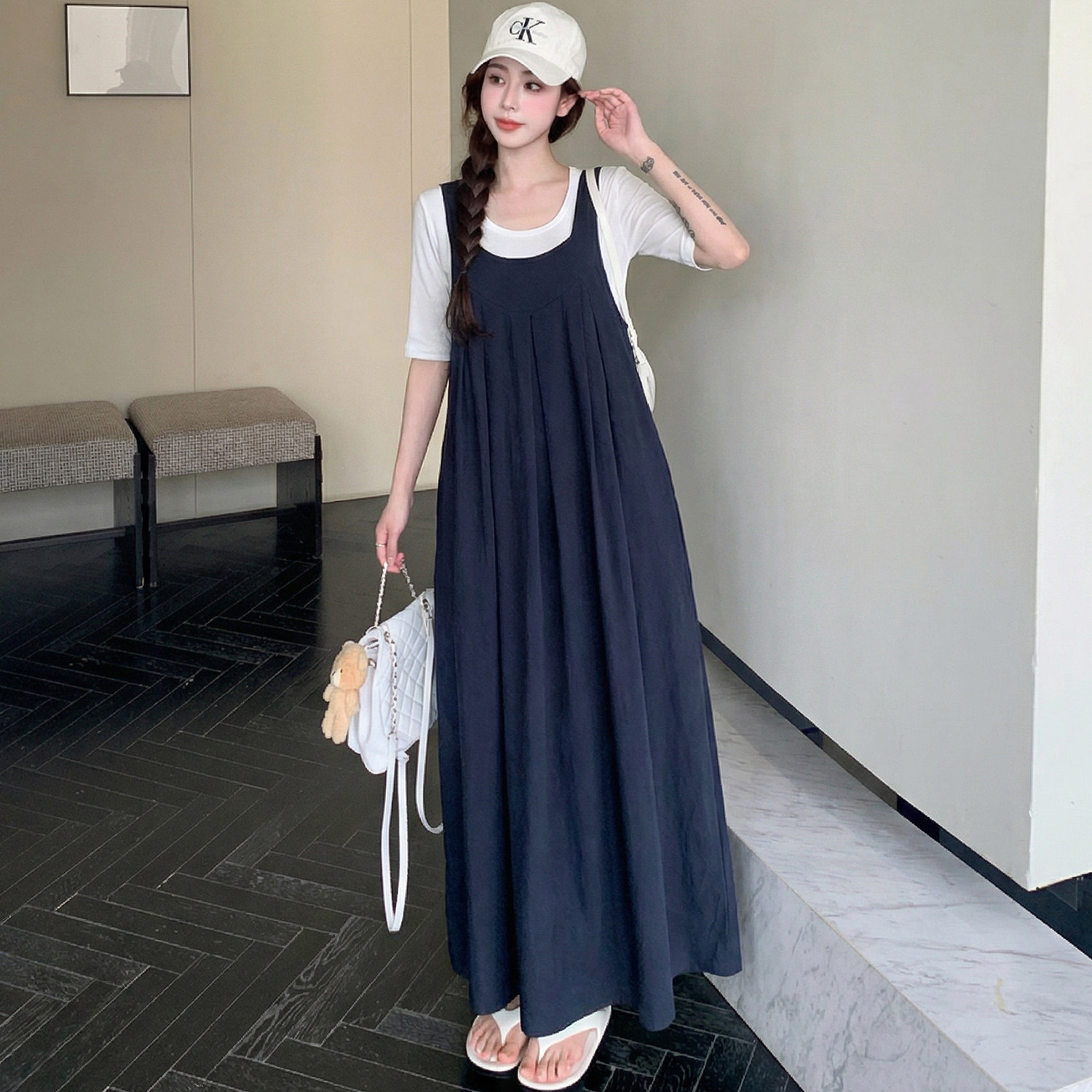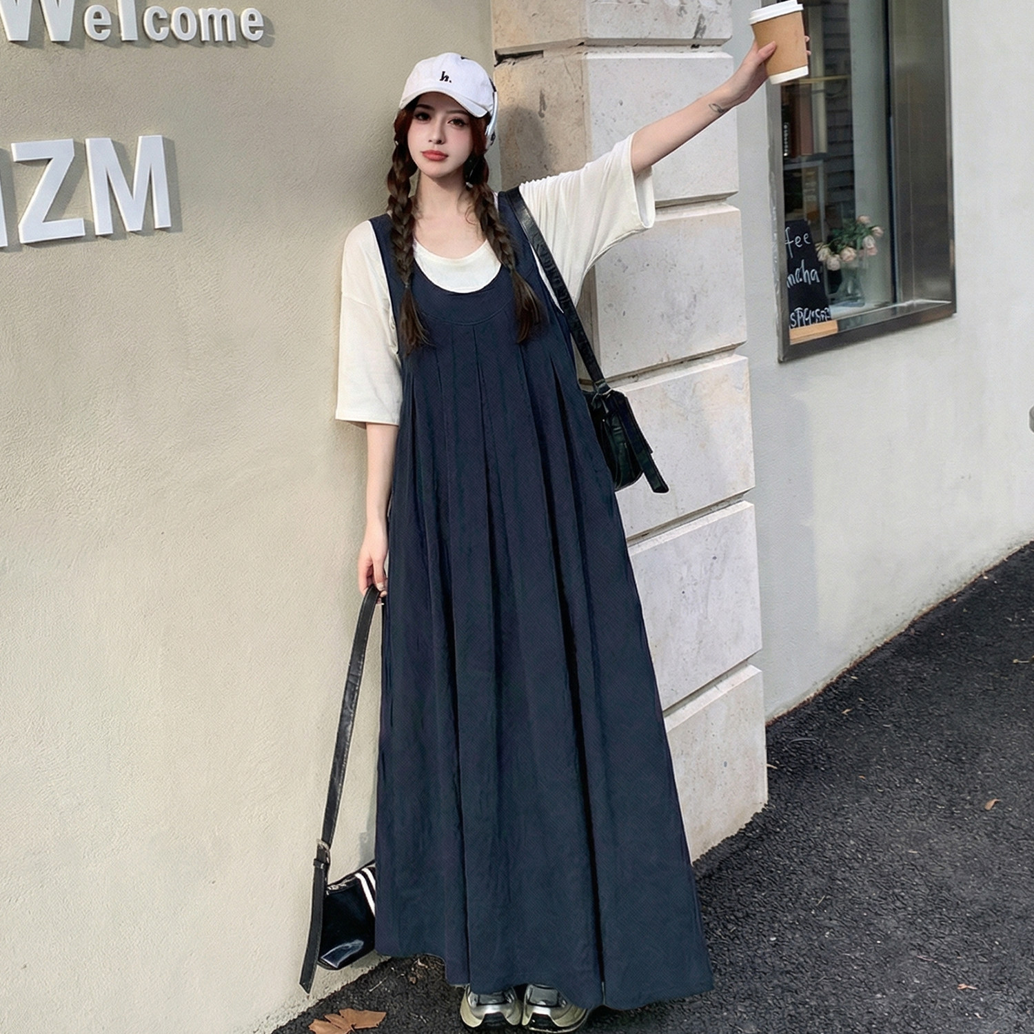 胖mm假两件背带短袖连衣裙女2026夏装新款高级感孕妇可穿休闲长裙