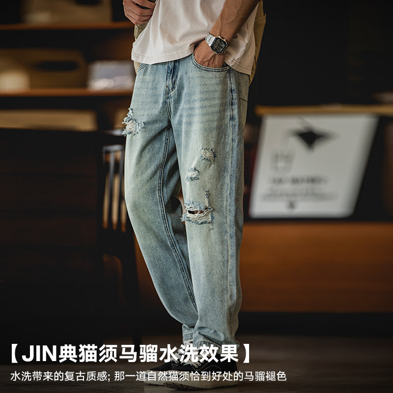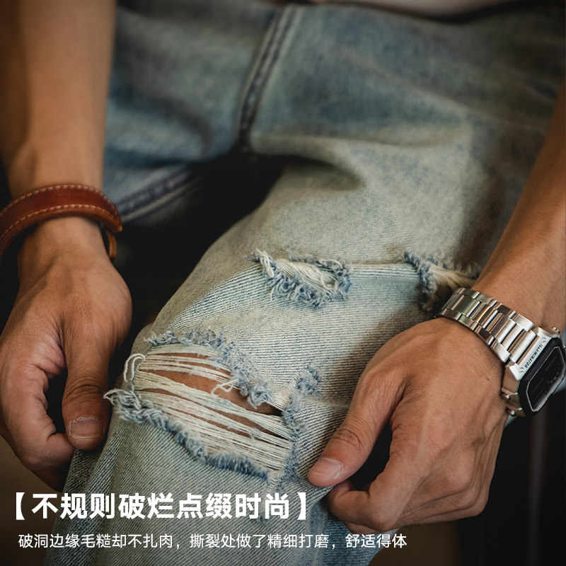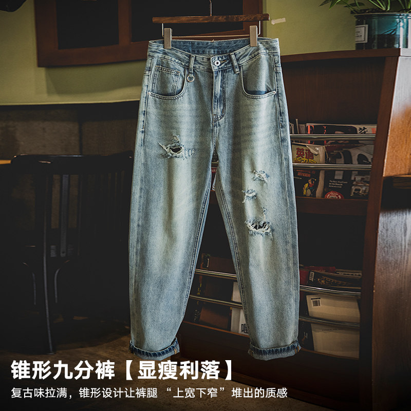 美式复古破洞九分牛仔裤男夏季2026新款猫须马骝水洗锥形裤子男裤