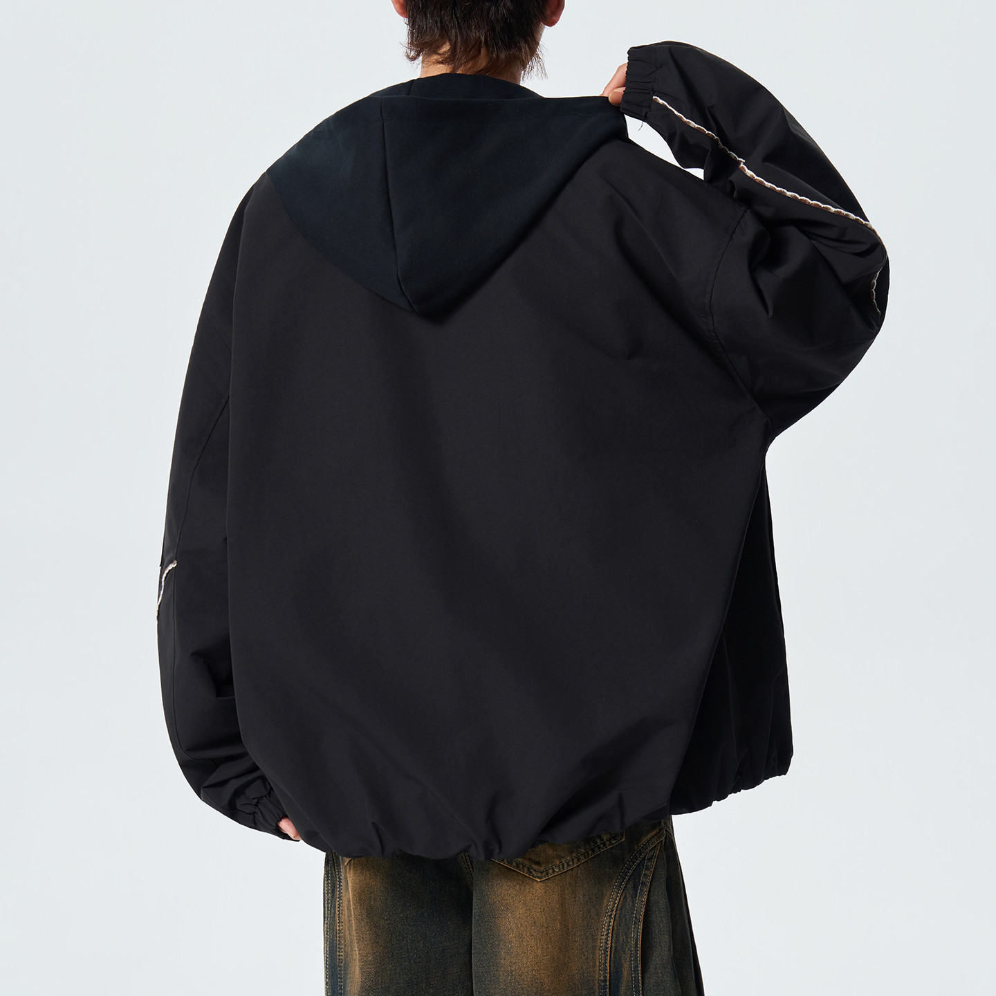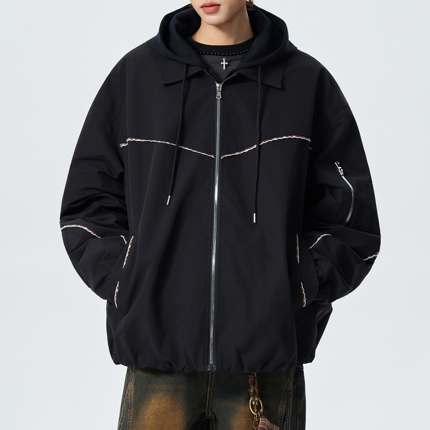男士春季休闲连帽外套拼接撞色假两件夹克男款2026新款大码宽松款