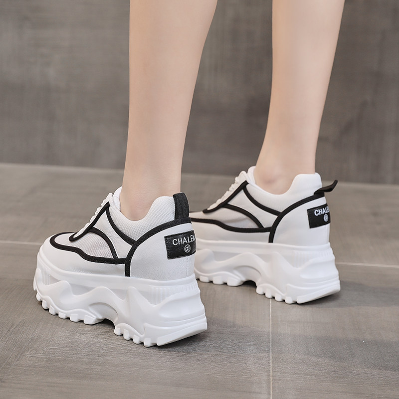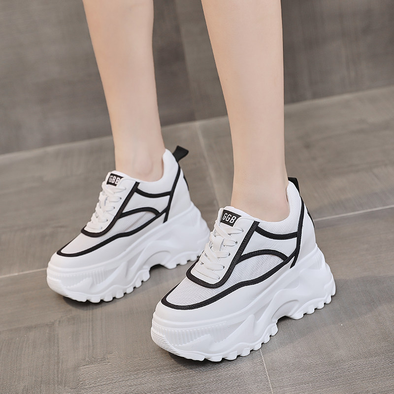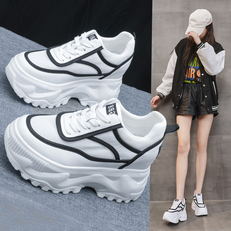 内增高女鞋春秋老爹鞋女透气拼色小个子超高跟系带白色圆头运动鞋