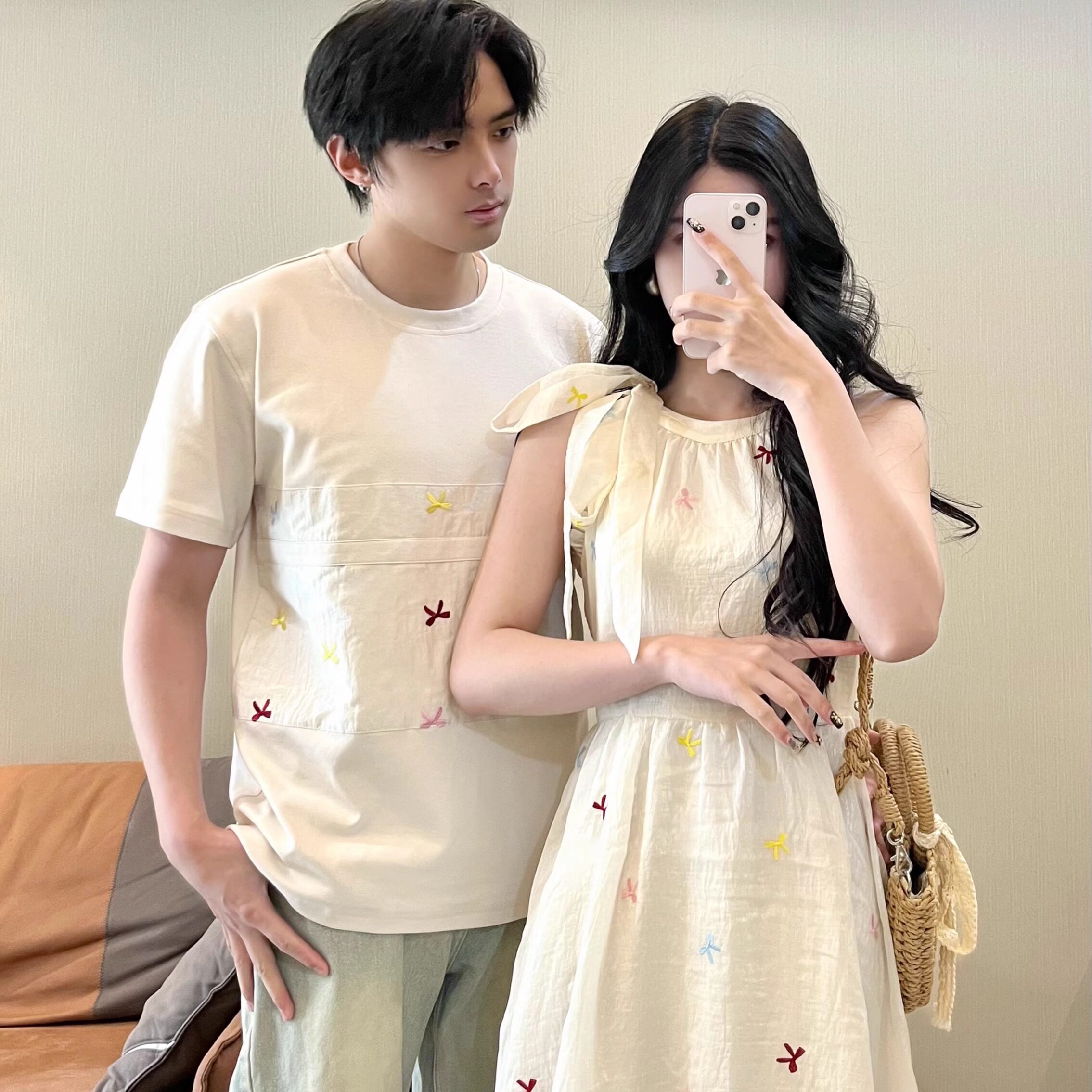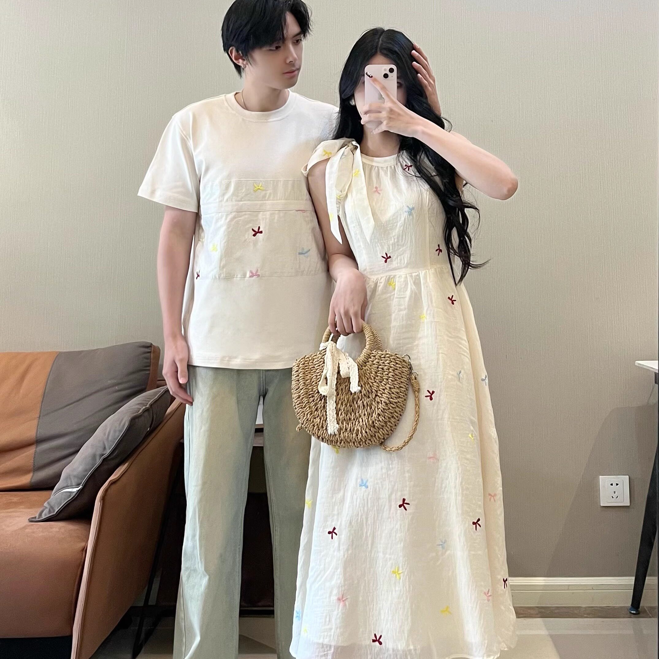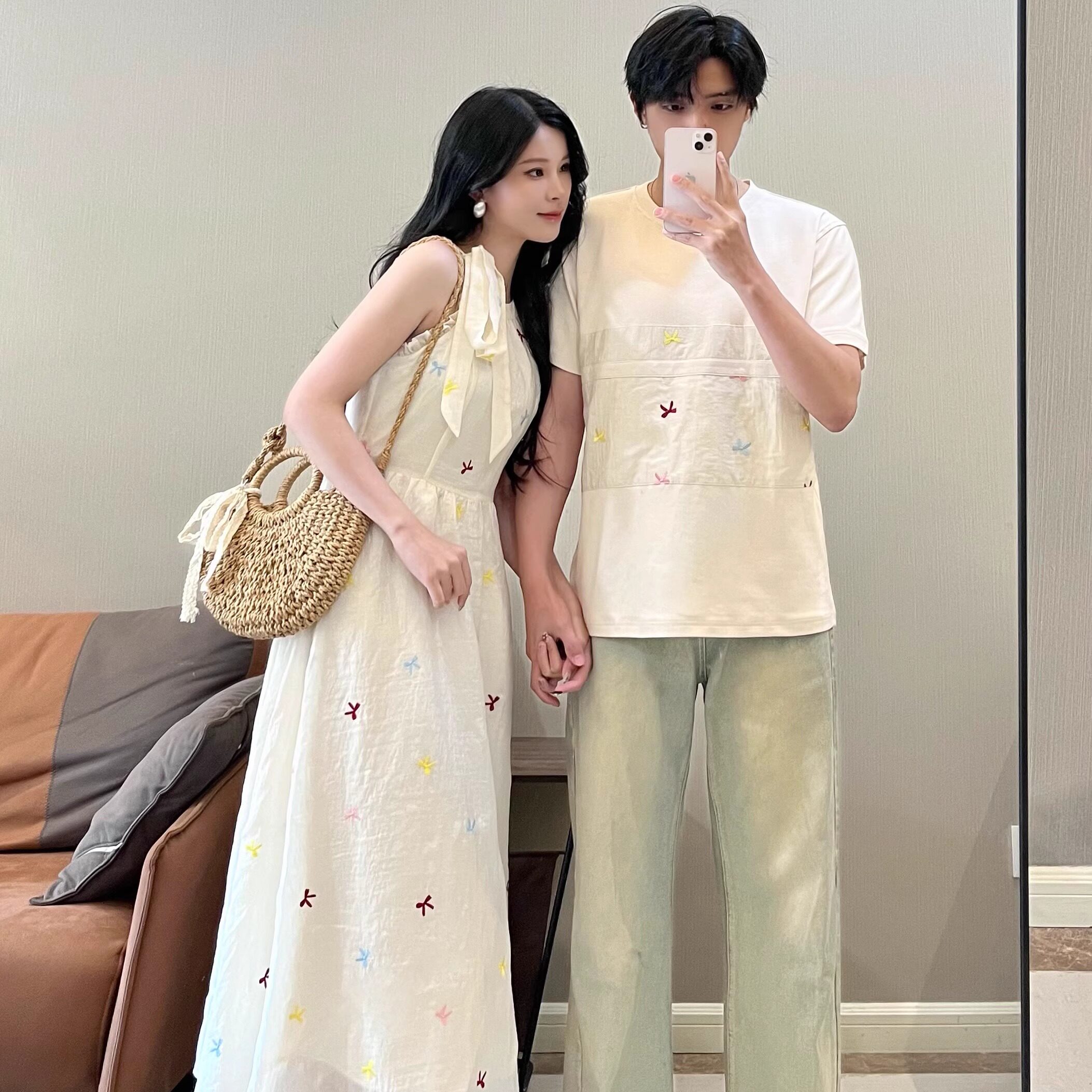 情侣装夏季2026法式茶歇海边度假风连衣裙女收腰挂脖吊带一裙一衣