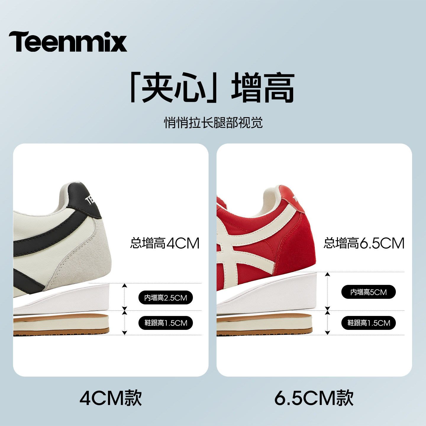 天美意彩虹夹心糖内增高厚底红色阿甘德训鞋女网面透气休闲运动鞋