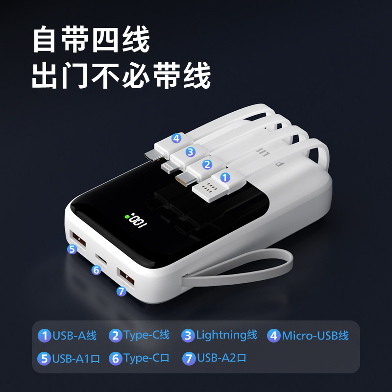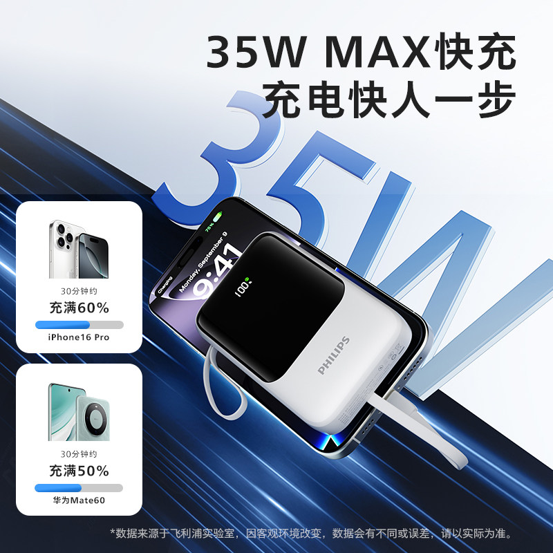 飞利浦充电宝20000毫安自带四线移动电源手机大容量22.5W快充PD35W苹果快充小巧便携可上飞机高铁火车