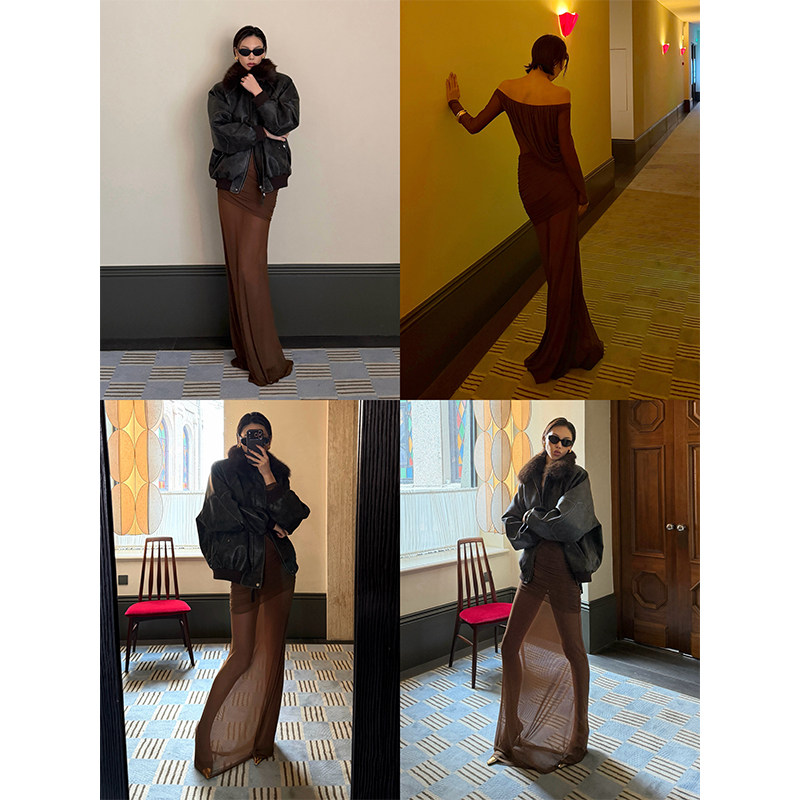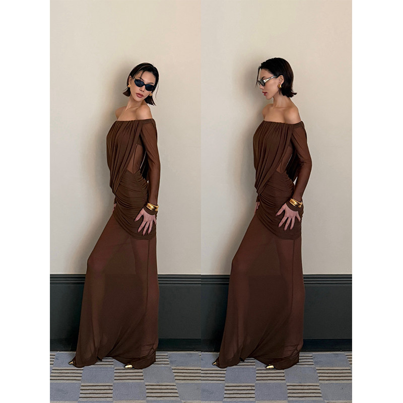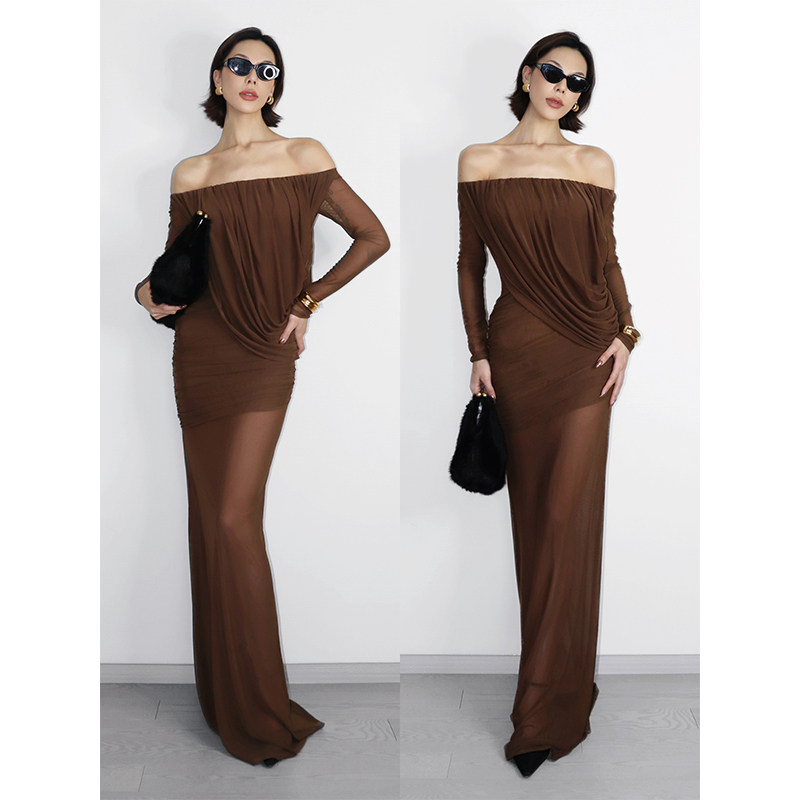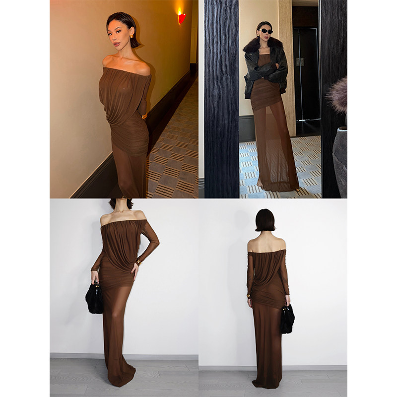 VanessaLab性感一字领长袖连衣裙女修身收腰一步裙气质显瘦长裙子